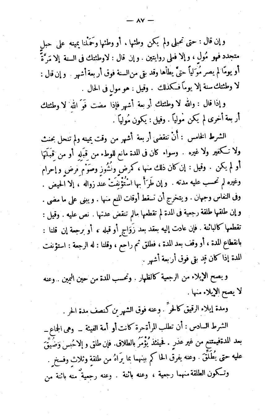 الشرط الخامس أن تنقضي أربعة أشهر من وقت يمينه ولم تنحل بحنث ولا تكفير ولا غيره وسواء كان في المدة مانع للوطء من قبله أو من قبلها أو لم يكن وقيل إن كان ذلك منها كمرض ونشوز وصوم فرض وإحرام وغيره لم تحسب عليه مدته وإن طرأ بها استؤنفت عند زواله ألا الحيض وفي النفاس وجهان ويتخرج أن تسقط أوقات المنع منها ويبني على ما مضى وإن طلقها طلقة رجعية في المدة لم تقطعها مالم تنقض عدتها نص عليه وقيل تقطعها كالبائنة فإن عادت إليه بعقد بعد زواج أو قبله أو برجعة إن قلنا بانقطاع المدة أو وقف بعد المدة فطلق ثم راجع وقلنا له الرجعة استؤنفت المدة إذا كان قد بقي فوق أربعة أشهر.