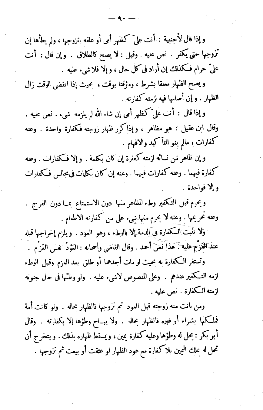 ومن بانت منه زوجته قبل العود ثم تزوجها قبل العود ثم تزوجها فالظهار بحالة ولو كانت أمة فملكها بشراء أو غيره فالظهار بحاله ولا يباح وطؤها إلا بكفارته وقال أبو بكر يحل له وطؤها وعليه كفارة يمين ويسقط ظهاره بذلك ويتخرج أن تحل له بملك اليمين بلا كفارة مع عود الظهار لو عتقت أو بيعت ثم تزوجها.