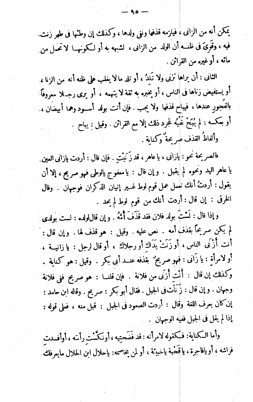 وأما الكناية فكقوله لامرأته قد فضحتيه أو نكست رأسه أو أفسدت فراشه أو يا فاجرة يا قحبة يا خبيثة أو لمن يخاصمه يا حلال ابن الحلال ما يعرفك