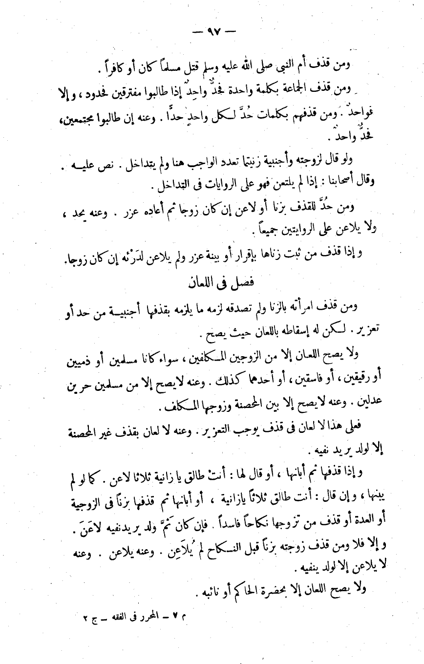 ولا يصح اللعان إلا من الزوجين المكلفين سواء كانا مسلمين أو ذميين أو رقيقين أو فاسقين أو أحدهما كذلك وعنه لا يصح إلا من مسلمين حرين عدلين وعنه لا يصح إلا بين المحصنة وزوجها المكلف.