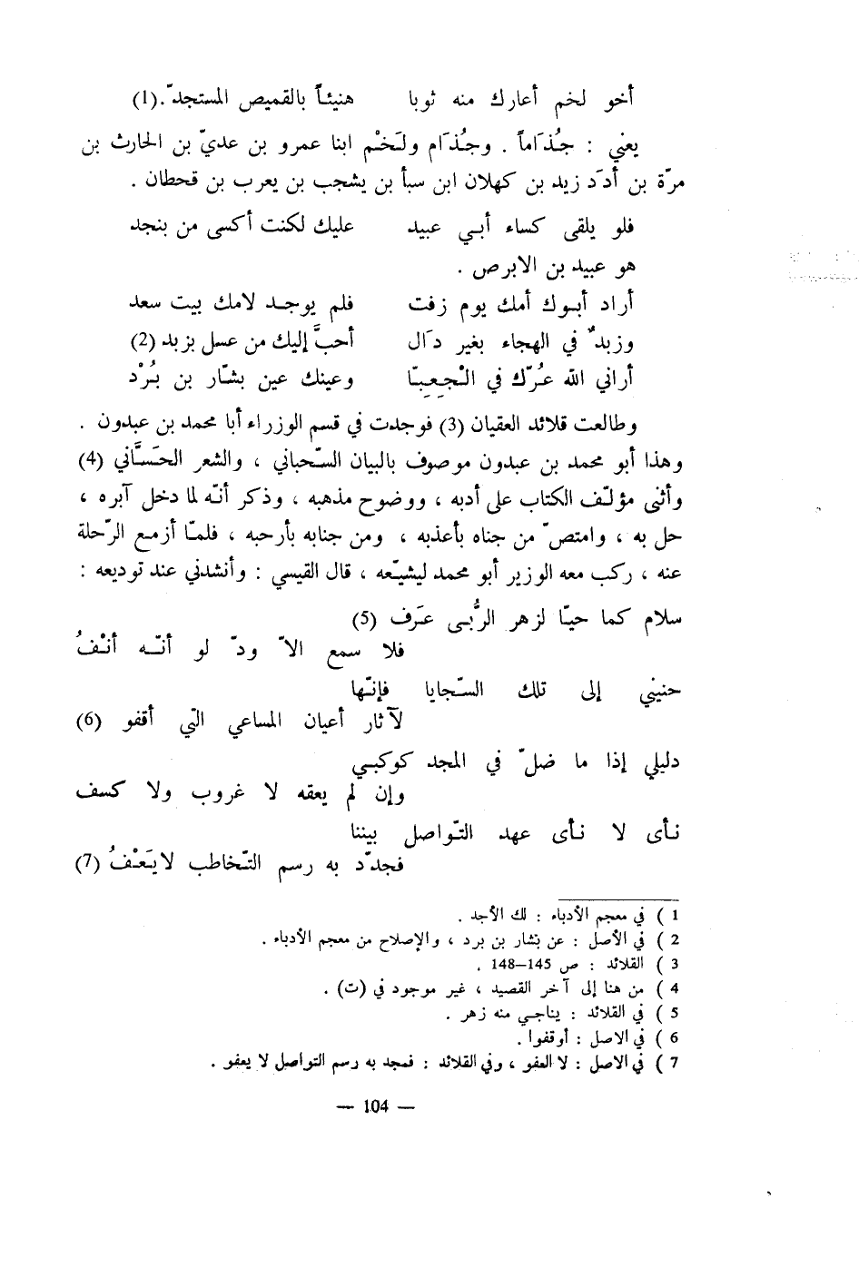 وطالعت قلائد العقيان فوجدت في قسم الوزراء أبا محمد بن عبدون. وهذا أبو محمد بن عبدون موصوف بالبيان السّحباني، والشعر الحسّاني وأثنى مؤلّف الكتاب على أدبه، ووضوح مذهبه، وذكر أنّه لما دخل آبره، حل به، وامتصّ من جناه بأعذبه، ومن جناب بأرحبه، فلما أزمع الرّحلة عنه، ركب معه الوزير أبو محمد ليشيّعه، قال القيسي: وأنشدني عند توديعه: