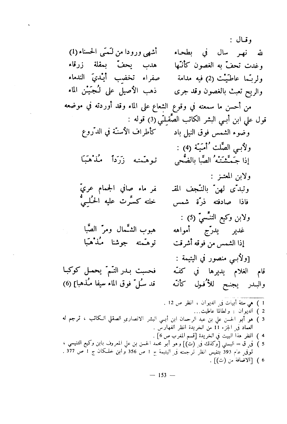 من أحسن ما سمعته في وقوع الشعاع على الماء وقد أوردته في موضعه قول علي ابن أبي البشر الكاتب الصّقِلّي قوله: