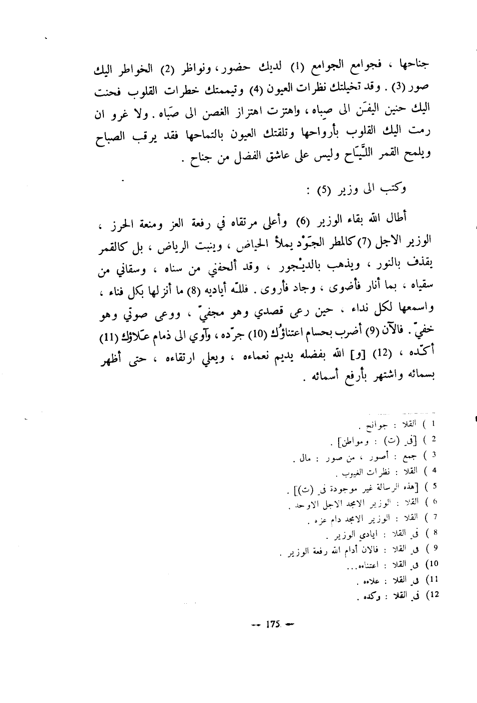 أطال الله بقاء الوزير وأعلى مرتقاه في رفعة العز ومنعة الحرز، الوزير الأجل كالمطر الجَوْد يملأ الحياض، وينبت الرياض، بل كالقمر يقذف بالنور، ويذهب بالديْجور، وقد ألحفني من سناه، وسقاني من سقياه، بما أنار فأضوى، وجاد فأروى. فلله أياديه ما أنزلها بكل فناء، وأسمعها لكل نداء، حين رعى قصدي وهو مجفيّ، ووعى صوتي وهو خفيّ. فالآن أضرب بحسام اعتناؤك جرّده، وآوي الى ذمام عَلاؤك أكّده، والله بفضله يديم نعماءه، ويعلي ارتقاءه، حتى أظهر بسمائه واشتهر بأرفع أسمائه.