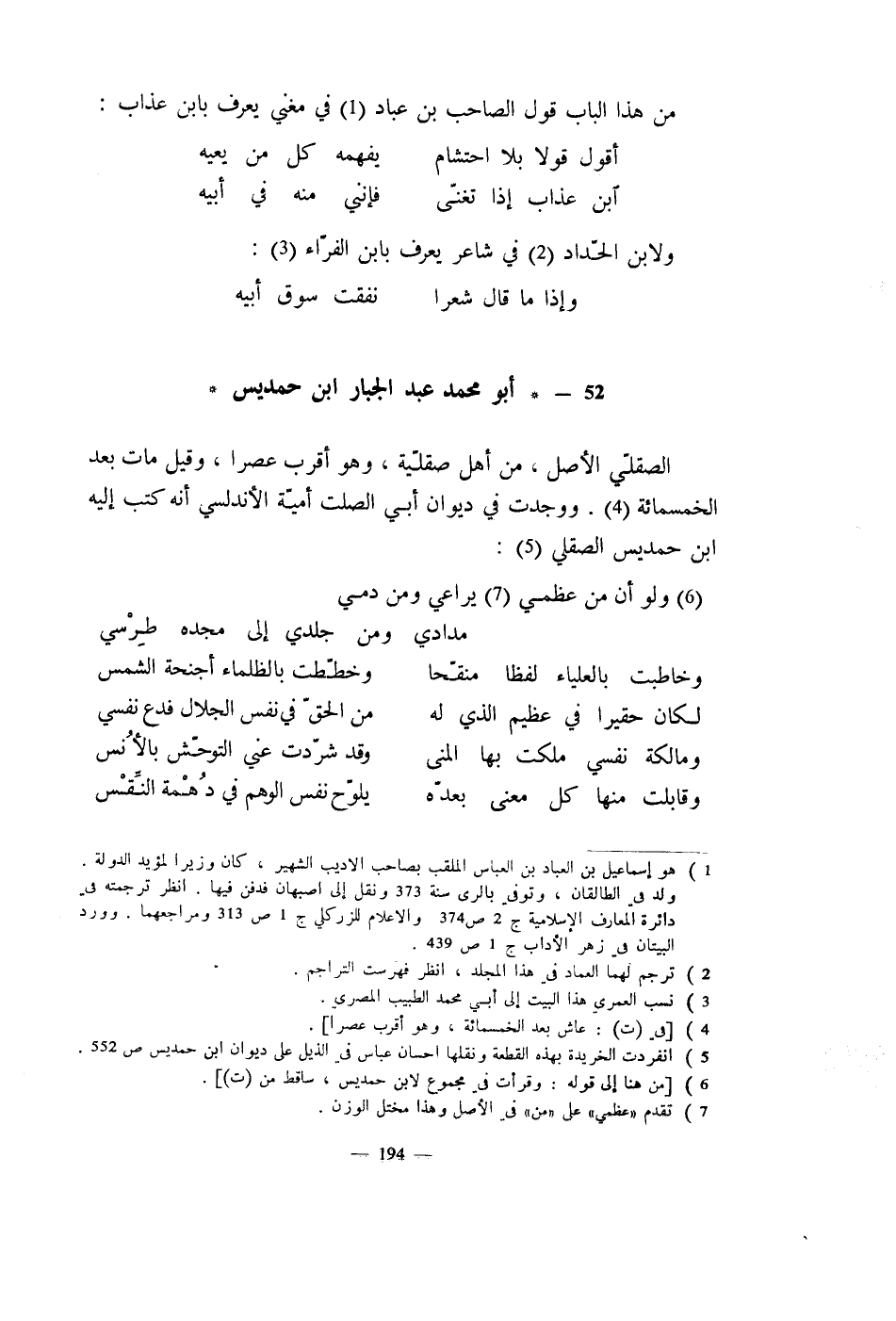 من هذا الباب قول الصاحب بن عباد في مغني يعرف بابن عذاب: