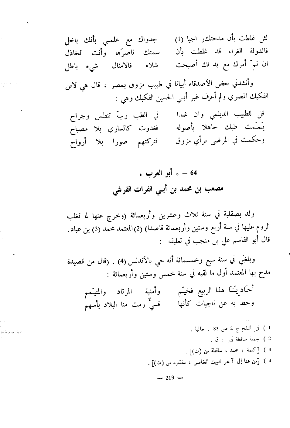 وأنشدني بعض الأصدقاء أبياتاً في طبيب مزوق بمصر، قال هي لابن الفكيك المصري ولم أعرف غير أبي الحسين الفكيك وهي: