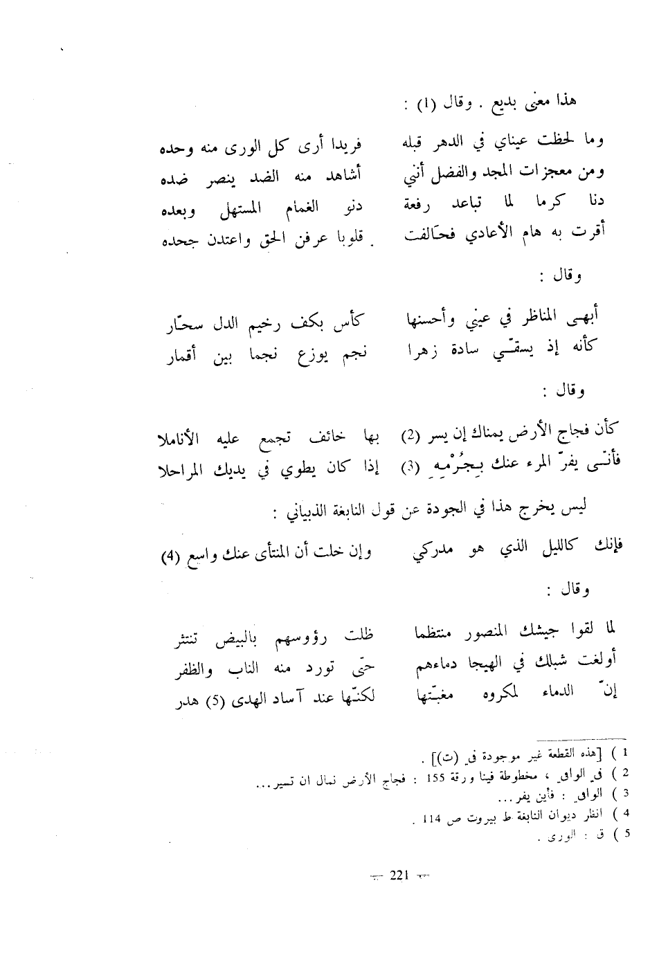 ليس يخرج هذا في الجودة عن قول النابغة الذبياني: