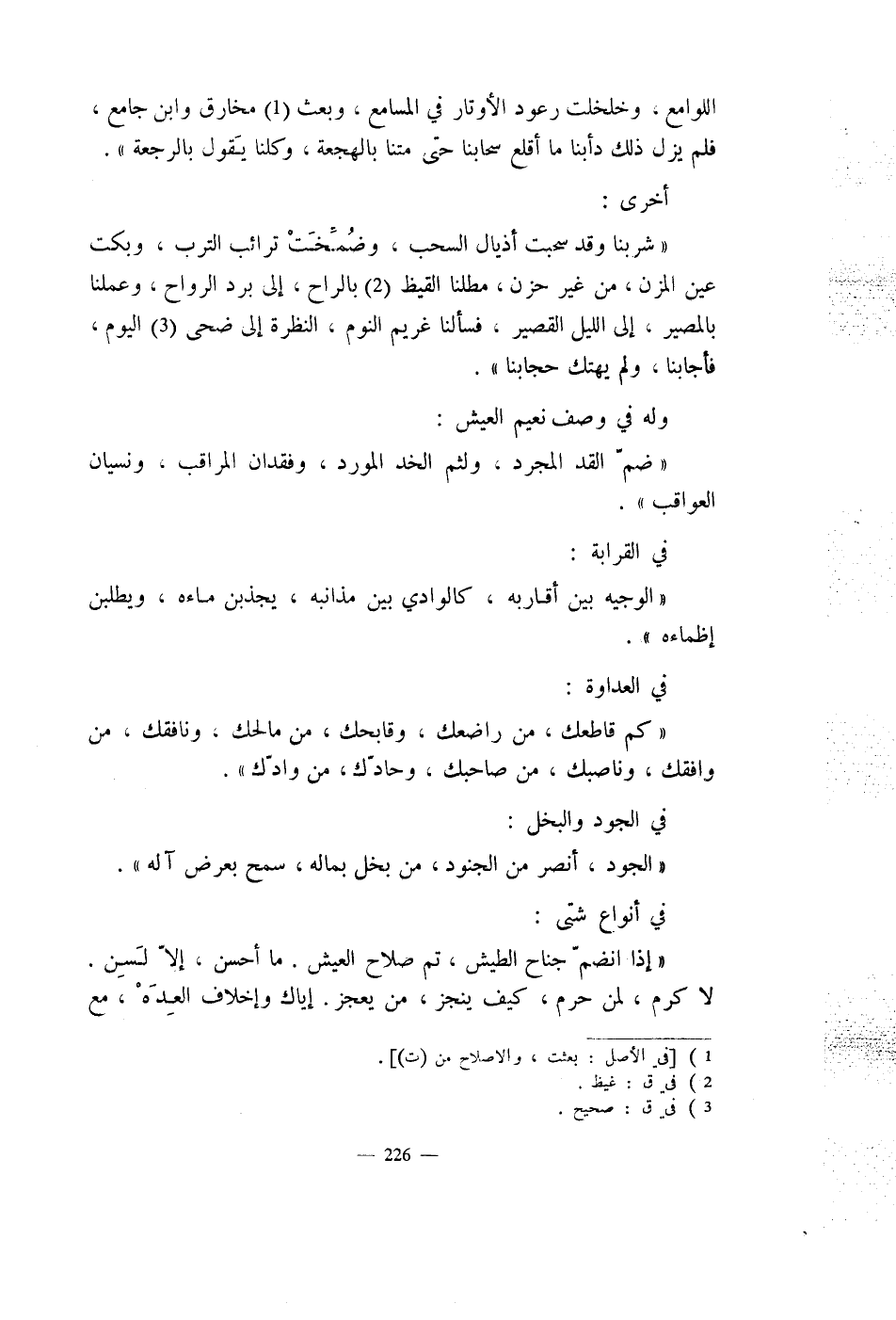 أخرى: شربنا وقد سحبت أذيال السحب، وضُمِّختْ ترائب الترب، وبكت عين المزن، من غير حزن، مطلنا القيظ بالراح، الى برد الرواح، وعملنا بالمصير، الى الليل القصير، فسألنا غريم النوم، النظرة الى ضحى اليوم، فأجابنا، ولم يهتك حجابنا.