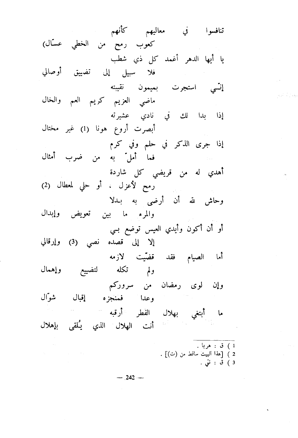 يا أيّها الدهر أغمد كل ذي شطب ... فلا سبيل الى تضييق أوصالي