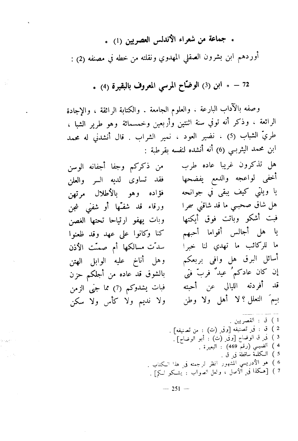 وصفه بالآداب البارعة، والعلوم الجامعة، والكتابة الرائقة، والإجادة الرائعة، وذكر أنه توفي سنة اثنتين وأربعين وخمسمائة وهو طرير الشبا، طريّ الشباب، نضير العود، نمير الشراب. قال أنشدني له محمد بن محمد اليثربي أنه أنشده لنفسه بقرطبة: