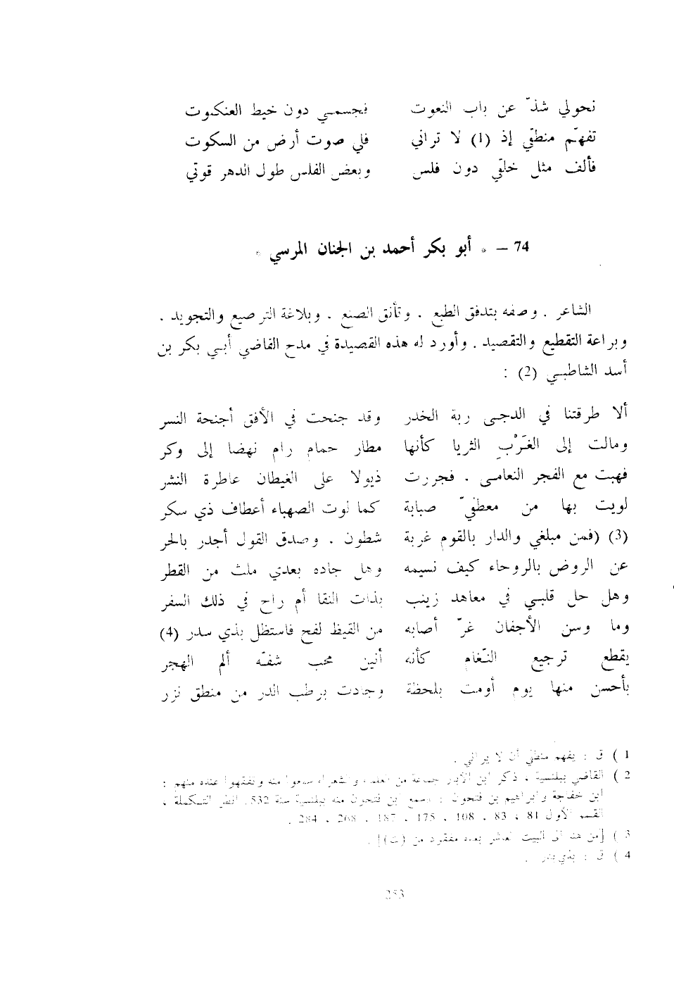 الشاعر. وصفه بتدفق الطبع، وتأنق الصنع، وبلاغة الترصيع والتجويد، وبراعة التقطيع والتقصيد. وأورد له هذه القصيدة في مدح القاضي أبي بكر بن أسد الشاطبي: