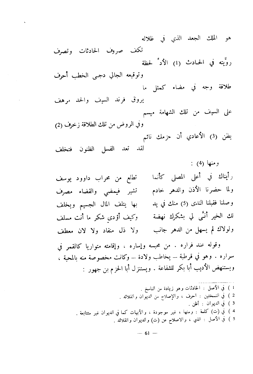 وقوله عند فراره، من محبسه وإساره، وإقامته متوارياً كالقمر في سراره، وهو في قرطبة - يخاطب ولادة - وكانت مخصوصة منه بالمحبة، ويستنهض الأديب أبا بكر للشفاعة، ويستنزل أبا الحزم بن جهور:
