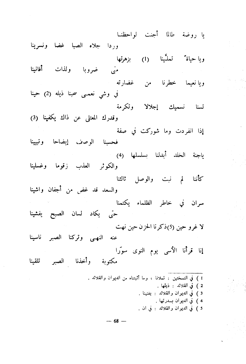 يا روضة طالما أجنت لواحظنا ... ورداً جلاه الصبا غضاً ونسرينا