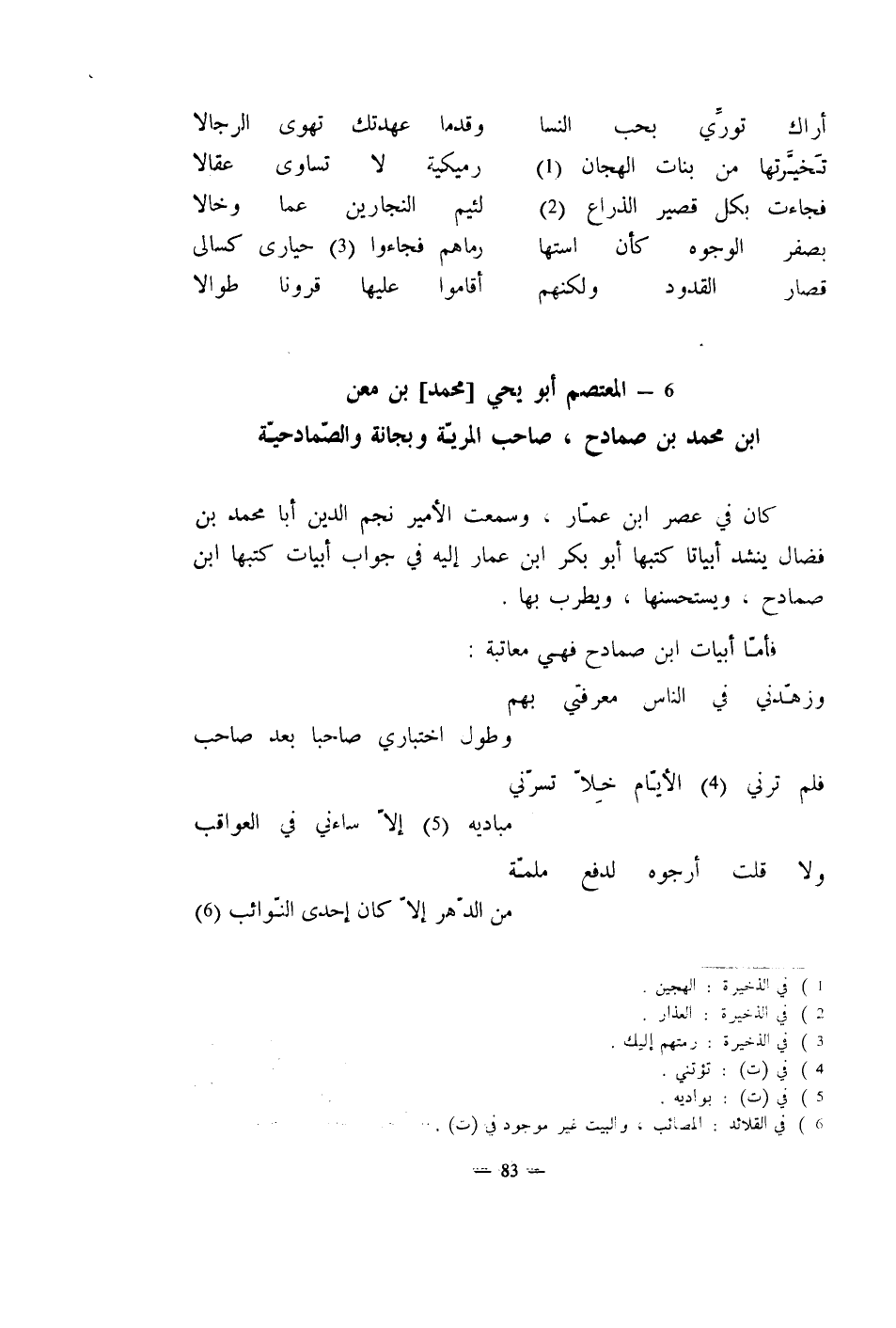 صاحب المريّة وبجانة والصّمادحيّة كان في عصر ابن عمار، وسمعت الأمير نجم الدين أبا محمد بن فضال ينشد أبياتاً كتبها أبو بكر بن عمار إليه في جواب أبيات كتبها ابن صمادح، ويستحسنها، ويطرب بها.