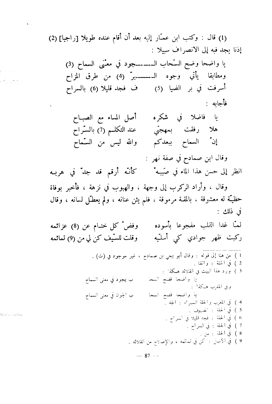 قال: وكتب ابن عمار إليه بعد أن أقام عنده طويلاً راجياً إذناً يجد فيه الى الانصراف سبيلاً: