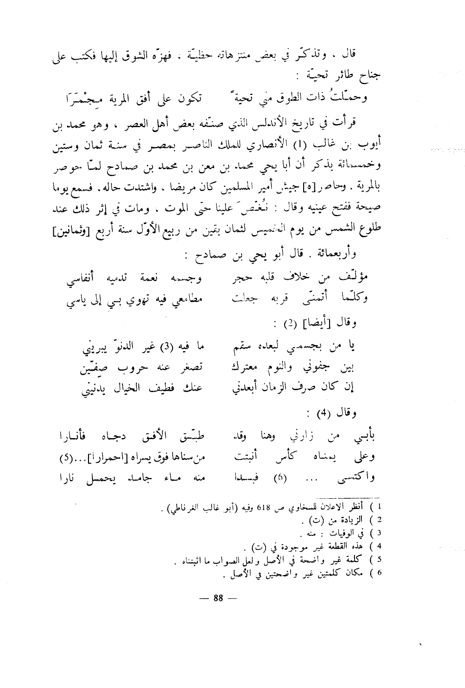 قرأت في تاريخ الأندلس الذي صنّفه بعض أهل العصر، وهو محمد بن أيوب بن غالب الأنصاري للملك الناصر بمصر في سنة ثمان وستين وخمسمائة يذكر أن أبا يحيى محمد بن معن بن محمد بن صمادح لمّا حوصر بالمرية، وحاصره جيش أمير المسلمين كان مريضاً، واشتدت حاله، فسمع يوماً صيحة ففتح عينيه وقال: نُغّصَ علينا حتى الموت، ومات في إثر ذلك عند طلوع الشمس من يوم الخميس لثمان بقين من ربيع الأول سنة أربع وثمانين وأربعمائة. قال أبو يحيى بن صمادح: