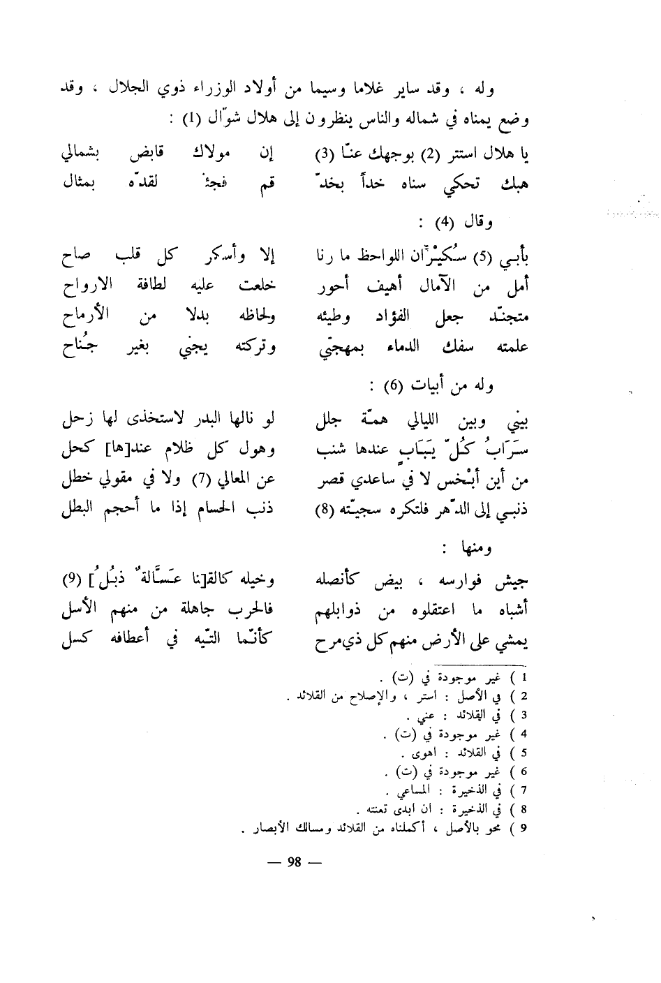 وله، وقد ساير غلاماً وسيماً من أولاد الوزراء ذوي الجلال، وقد وضع يمناه في شماله والناس ينظرون الى هلال شوّال: