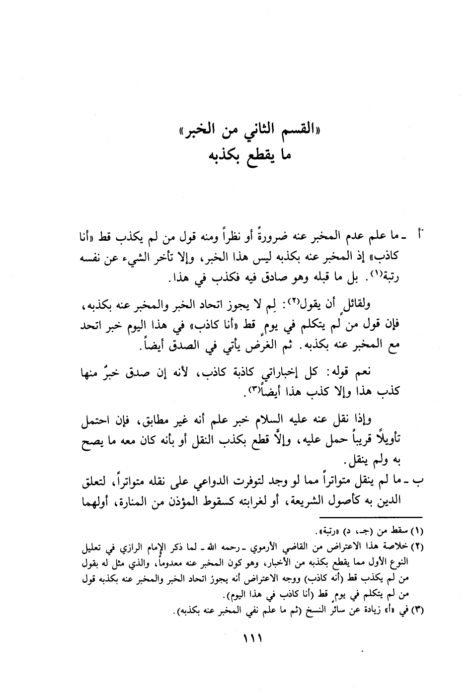 (٢) خلاصة هذا الاعتراض من القاضي الأرموي - رحمه الله - لما ذكر الإمام الرازي في تعليل النوع الأول مما يقطع بكذبه من الأخبار، وهو كون المخبر عنه معدومًا، والذي مثل له بقول من لم يكذب قط (أنَّه كاذب) ووجه الاعتراض أنَّه يجوز اتحاد الخبر والمخبر عنه بكذبه قول من لم يتكلم في يومٍ قط (أنا كاذب في هذا اليوم).