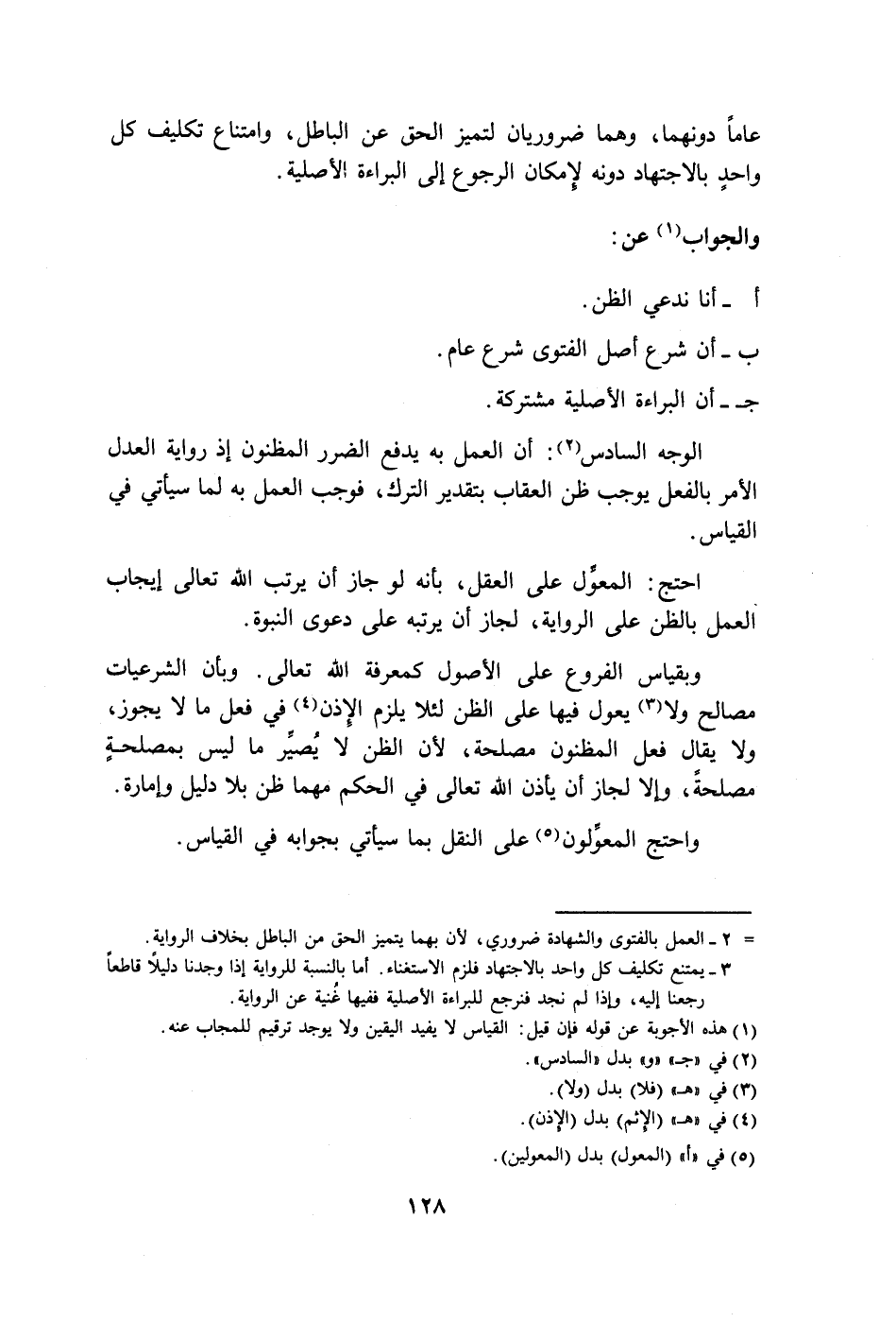 وبقياس الفروع على الأصول كمعرفة الله تعالى. وبأن الشرعيات مصالح ولا (٣) يعول فيها على الظن لئلا يلزم الإِذن (٤) في فعل ما لا يجوز، ولا يقال فعل المظنون مصلحة، لأن الظن لا يُصيِّر ما ليس بمصلحةٍ مصلحةً، والا لجاز أن ياذن الله تعالى في الحكم مهما ظن بلا دليل وإمارة.