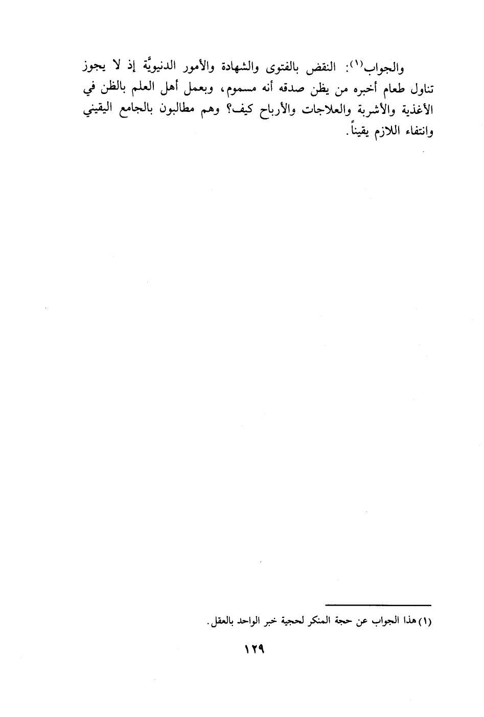 والجواب (١): النقض بالفتوى والشهادة والأمور الدنيويَّة إذ لا يجوز تناول طعام أخبره من يظن صدقه أنَّه مسموم، وبعمل أهل العلم بالظن في الأغذية والأشربة والعلاجات والأرباح كيف؟ وهم مطالبون بالجامع اليقيني وانتفاء اللازم يقينًا.