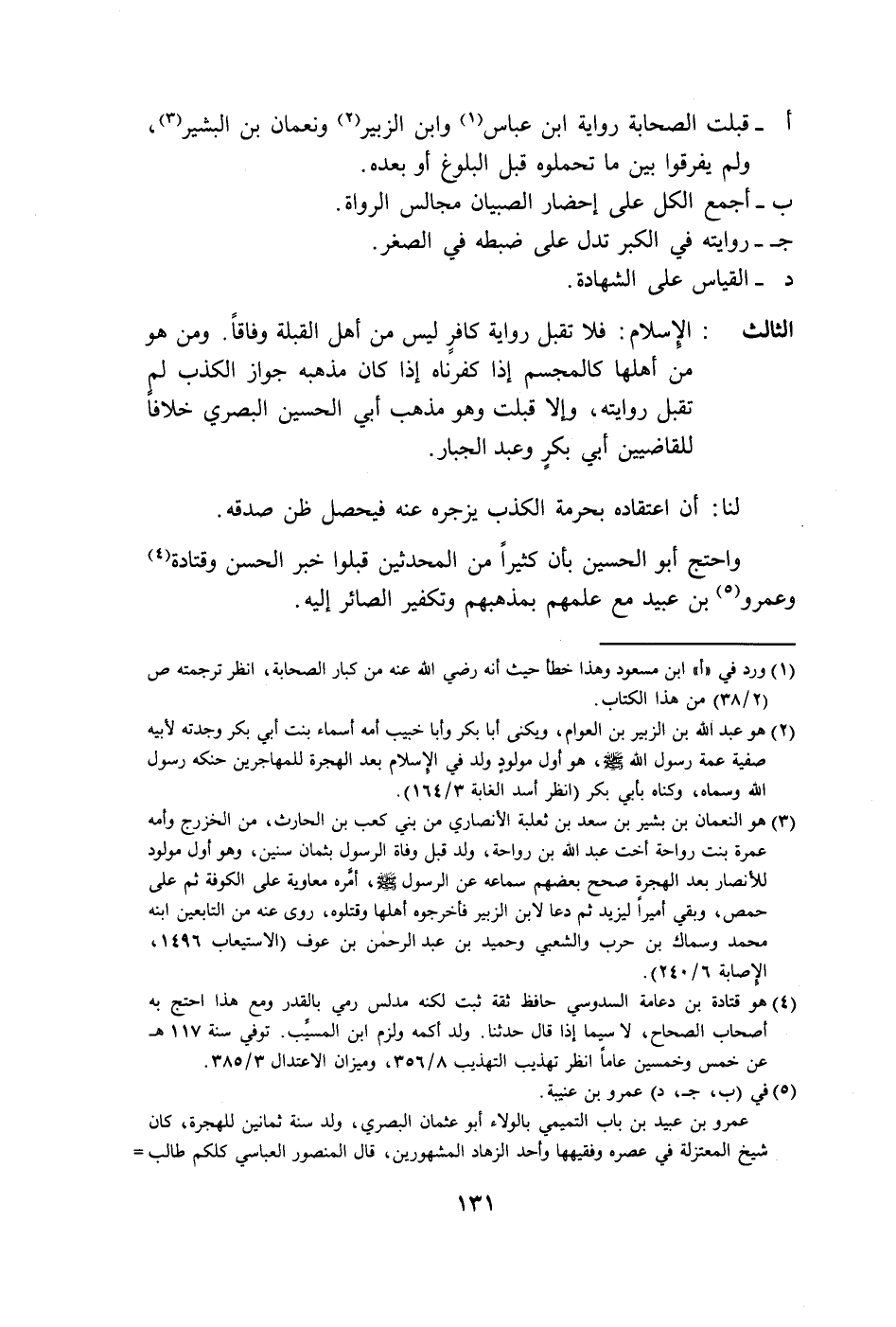 واحتج أبو الحسين بأن كثيرًا من المحدثين قبلوا خبر الحسن وقتادة (٤) وعمرو (٥) بن عبيد مع علمهم بمذهبهم وتكفير الصائر إليه.