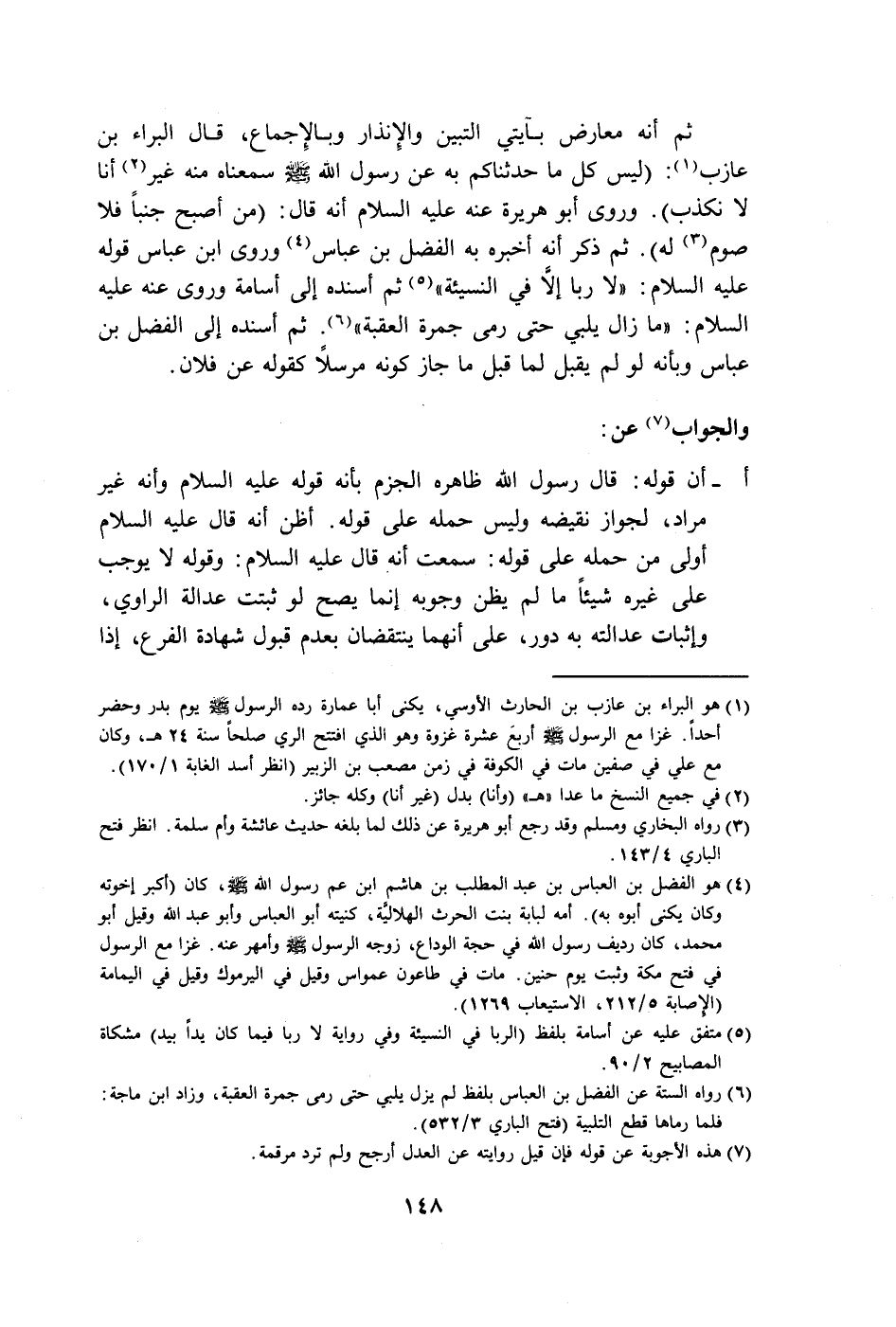 ثم أنَّه معارض بآيتي التبين والإِنذار وبالإِجماع، قال البراء بن عازب (١): (ليس كل ما حدثناكم به عن رسول الله - صلى الله عليه وسلم - سمعناه منه غير (٢) أنا لا نكذب). وروى أبو هريرة عنه عليه السلام أنَّه قال: (من أصبح جنبًا فلا صوم (٣) له). ثم ذكر أنَّه أخبره به الفضل بن عباس (٤) وروى ابن عباس قوله عليه السلام: "لا ربا إِلَّا في النسيئة" (٥) ثم أسنده إلى أسامة وروى عنه عليه السلام: "ما زال يلبي حتَّى رمى جمرة العقبة" (٦). ثم أسنده إلى الفضل بن عباس وبأنه لو لم يقبل لما قبل ما جاز كونه مرسلًا كقوله عن فلان.