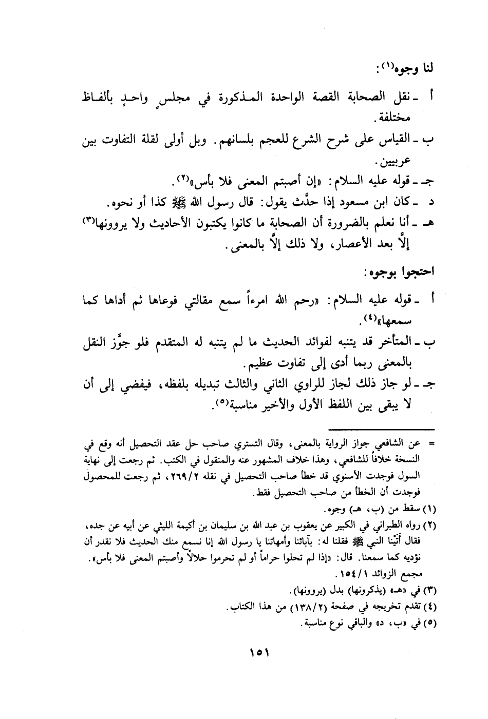 جـ- لو جاز ذلك لجاز للراوي الثاني والثالث تبديله بلفظه، فيفضي إلى أن لا يبقى بين اللفظ الأول والأخير مناسبة (٥).