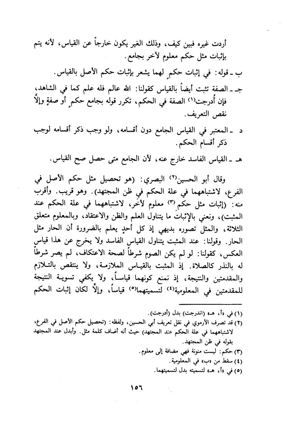 (٢) قد تصرف الأرموي في نقل تعريف أبي الحسين، ولفظه: (تحصيل حكم الأصل في الفرع، لاشتباههما في علة الحكم عند المجتهد) حيث أنَّه أضاف كلمة مثل. وأبدل عند المجتهد بقوله في ظن المجتهد.