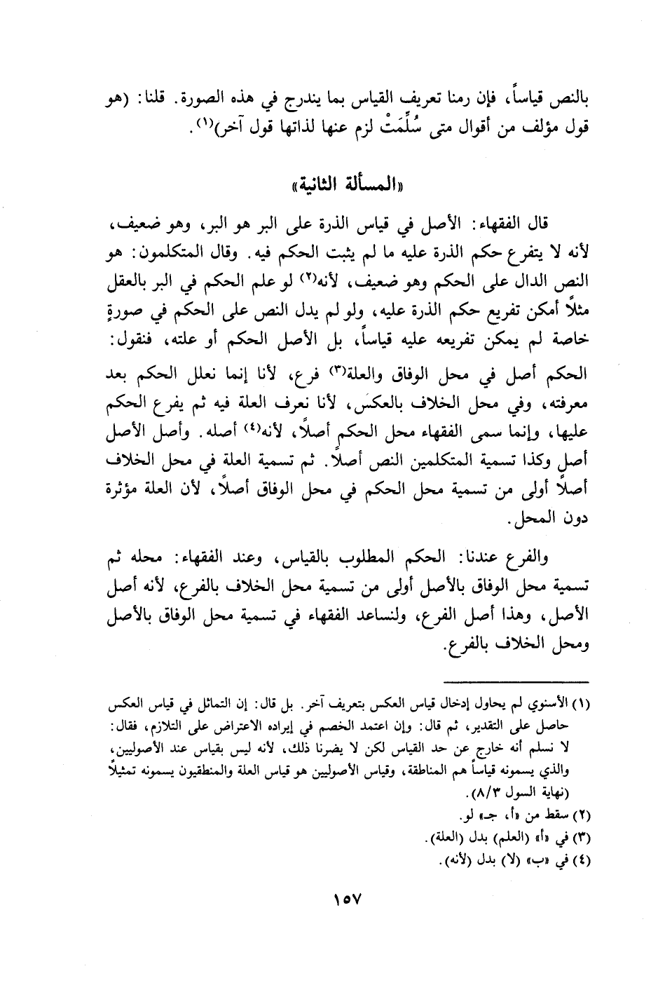 قال الفقهاء: الأصل في قياس الذرة على البر هو البر، وهو ضعيف، لأنه لا يتفرع حكم الذرة عليه ما لم يثبت الحكم فيه. وقال المتكلمون: هو النص الدال على الحكم وهو ضعيف. لأنه (٢) لو علم الحكم في البر بالعقل مثلًا أمكن تفريع حكم الذرة عليه، ولو لم يدل النص على الحكم في صورةٍ خاصة لم يمكن تفريعه عليه قياسًا، بل الأصل الحكم أو علته، فنقول: