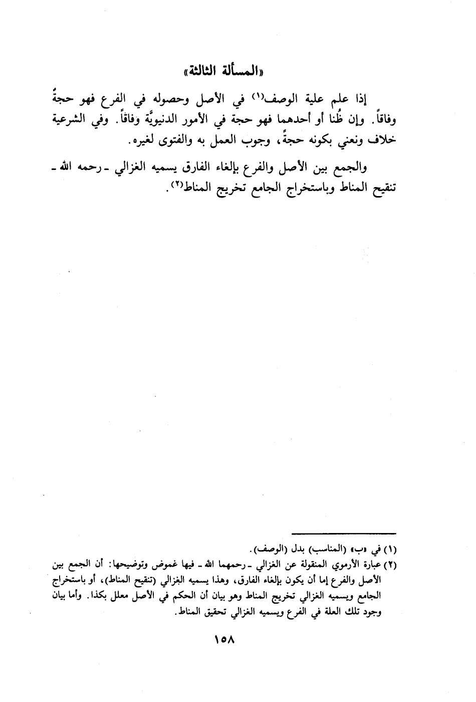 (٢) عبارة الأرموي المنقولة عن الغزالي -رحمهما الله- فيها غموض وتوضيحها: أن الجمع بين الأصل والفرع إما أن يكون بإلغاء الفارق، وهذا يسميه الغزالي (تنقيح المناط)، أو باستخراج الجامع ويسميه الغزالي تخريج المناط وهو بيان أن الحكم في الأصل معلل بكذا. وأما بيان وجود تلك العلة في الفرع ويسميه الغزالي تحقيق المناط.