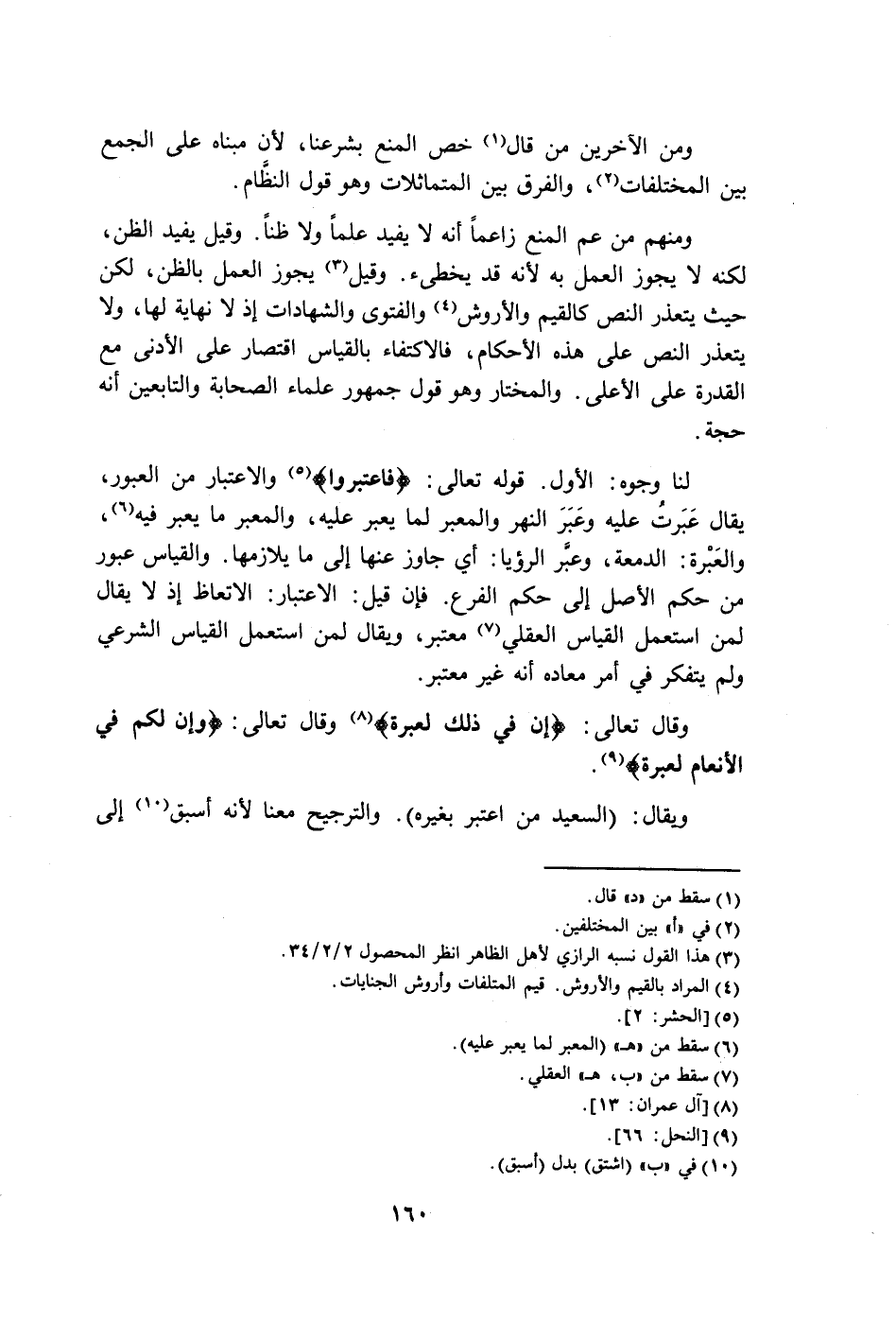 لنا وجوه: الأول. قوله تعالى: {فَاعْتَبِرُوا} (٥) والاعتبار من العبور، يقال عَبَرتُ عليه وعَبَرَ النهر والمعبر لما يعبر عليه، والمعبر ما يعبر فيه (٦)، والعَبْرة: الدمعة، وعبَّر الرؤيا: أي جاوز عنها إلى ما يلازمها. والقياس عبور من حكم الأصل إلى حكم الفرع. فإن قيل: الاعتبار: الاتعاظ إذ لا يقال لمن استعمل القياس العقلي (٧) معتبر، ويقال لمن استعمل القياس الشرعي ولم يتفكر في أمر معاده أنَّه غير معتبر.