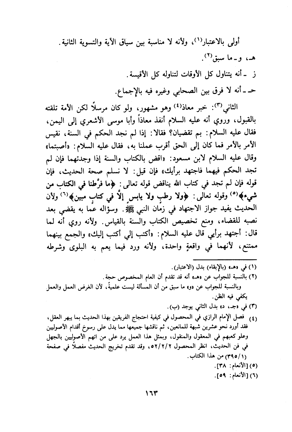 الثاني (٣): خبر معاذ (٤) وهو مشهور، ولو كان مرسلًا لكن الأمة تلقته بالقبول، وروي أنَّه عليه السلام أنفذ معاذًا وأبا موسى الأَشْعريّ إلى اليمن، فقال عليه السلام: بم تقضيان؟ فقالا: إذا لم نجد الحكم في السنة، نقيس الأمر بالأمر فما كان إلى الحق أقرب عملنا به، فقال عليه السلام: "أصبتما" وقال عليه السلام لابن مسعود: "اقصر بالكتاب والسنة إذا وجدتهما فإن لم تجد الحكم فيهما فاجتهد برأيك" فإن قيل: لا نسلم صحة الحديث، فإن قوله فإن لم تجد في كتاب الله يناقض قوله تعالى: {مَا فَرَّطْنَا فِي الْكِتَابِ مِنْ شَيْءٍ} (٥) وقوله تعالى: {وَلَا رَطْبٍ وَلَا يَابِسٍ إِلَّا فِي كِتَابٍ مُبِينٍ} (٦) ولأن الحديث يفيد جواز الاجتهاد في زمًان النَّبِيّ - صلى الله عليه وسلم -. وسؤاله عما به يقضي بعد نصبه للقضاء، ومنع تخصيص الكتاب والسنة بالقياس. ولأنه روي أنَّه لما قال: أجتهد برأي قال عليه السلام: "أكتب إلى أكتب إليك" والجمع بينهما ممتنع, لأنهما في واقعةٍ واحدة، ولأنه ورد فيما يعم به البلوى وشرطه