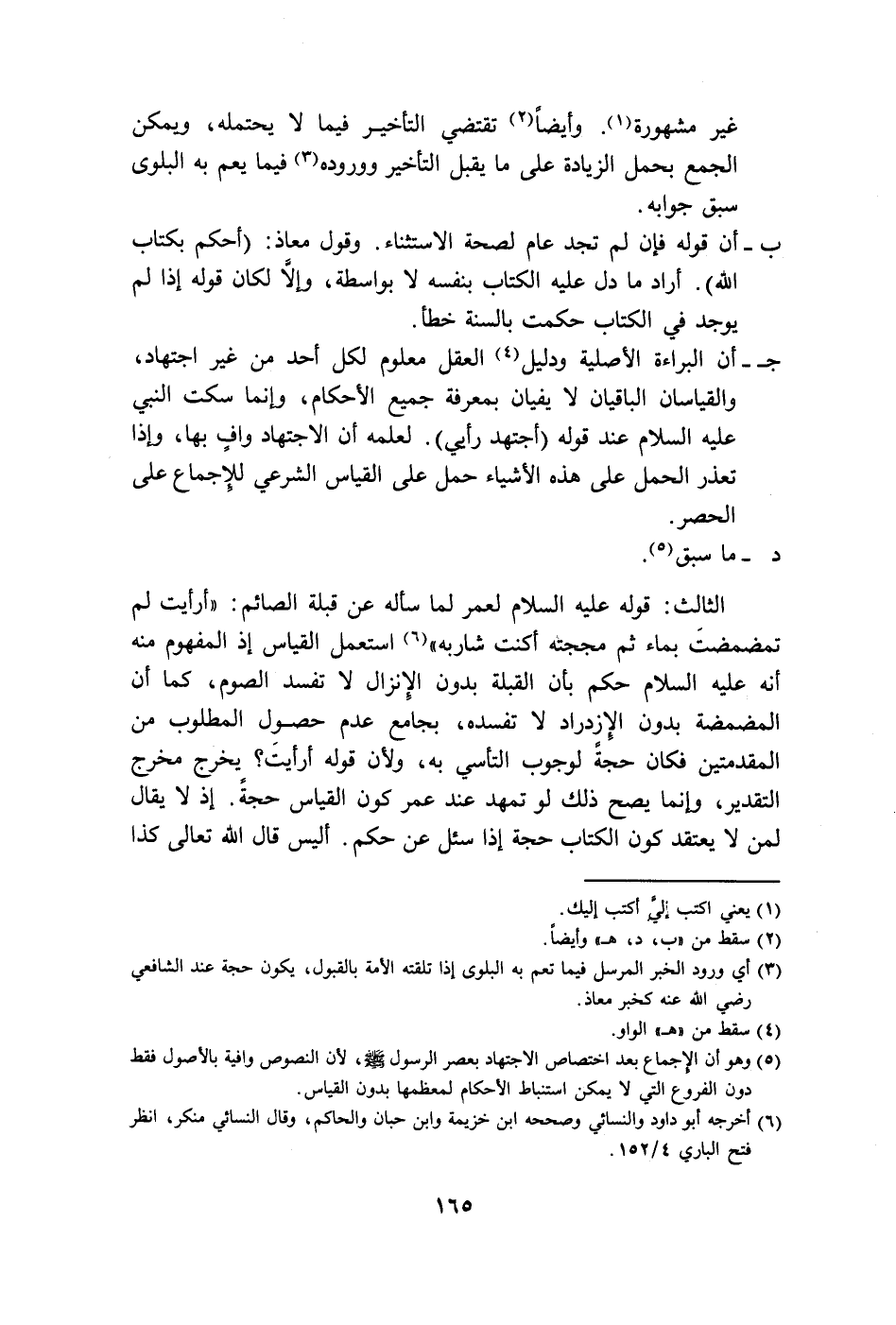 ب- أن البراءة الأصلية ودليل (٤) العقل معلوم لكل أحد من غير اجتهاد، والقياسان الباقيان لا يفيان بمعرفة جميع الأحكام، وإنما سكت النَّبِيّ عليه السلام عند قوله (أجتهد رأيي). لعلمه أن الاجتهاد وافٍ بها، وإذا تعذر الحمل على هذه الأشياء حمل على القياس الشرعي للإجماع على الحصر.
