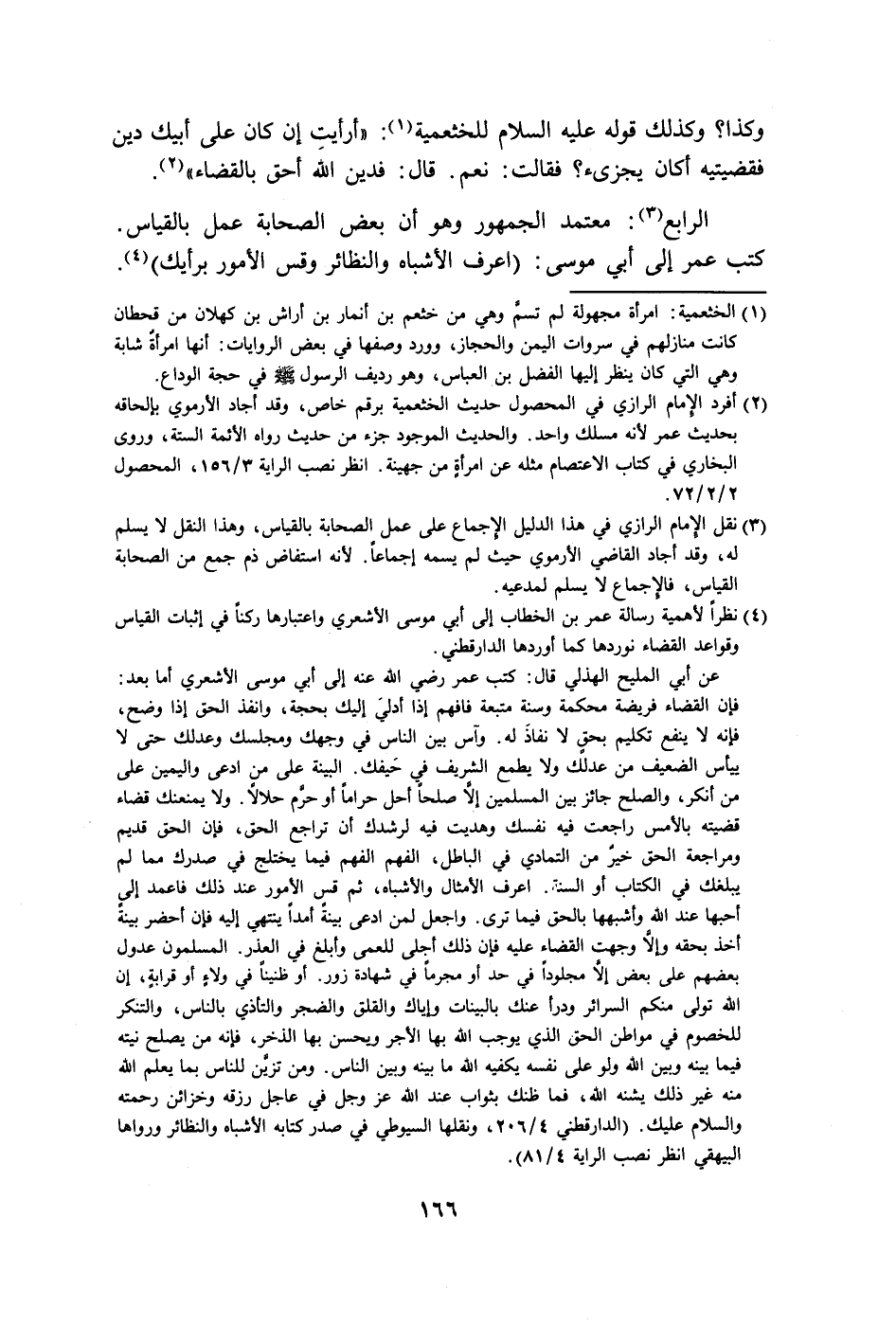 (٤) نظرًا لأهمية رسالة عمر بن الخطاب إلى أبي موسى الأَشْعريّ واعتبارها ركنًا في إثبات القياس وقواعد القضاء نوردها كما أوردها الدارقطني.