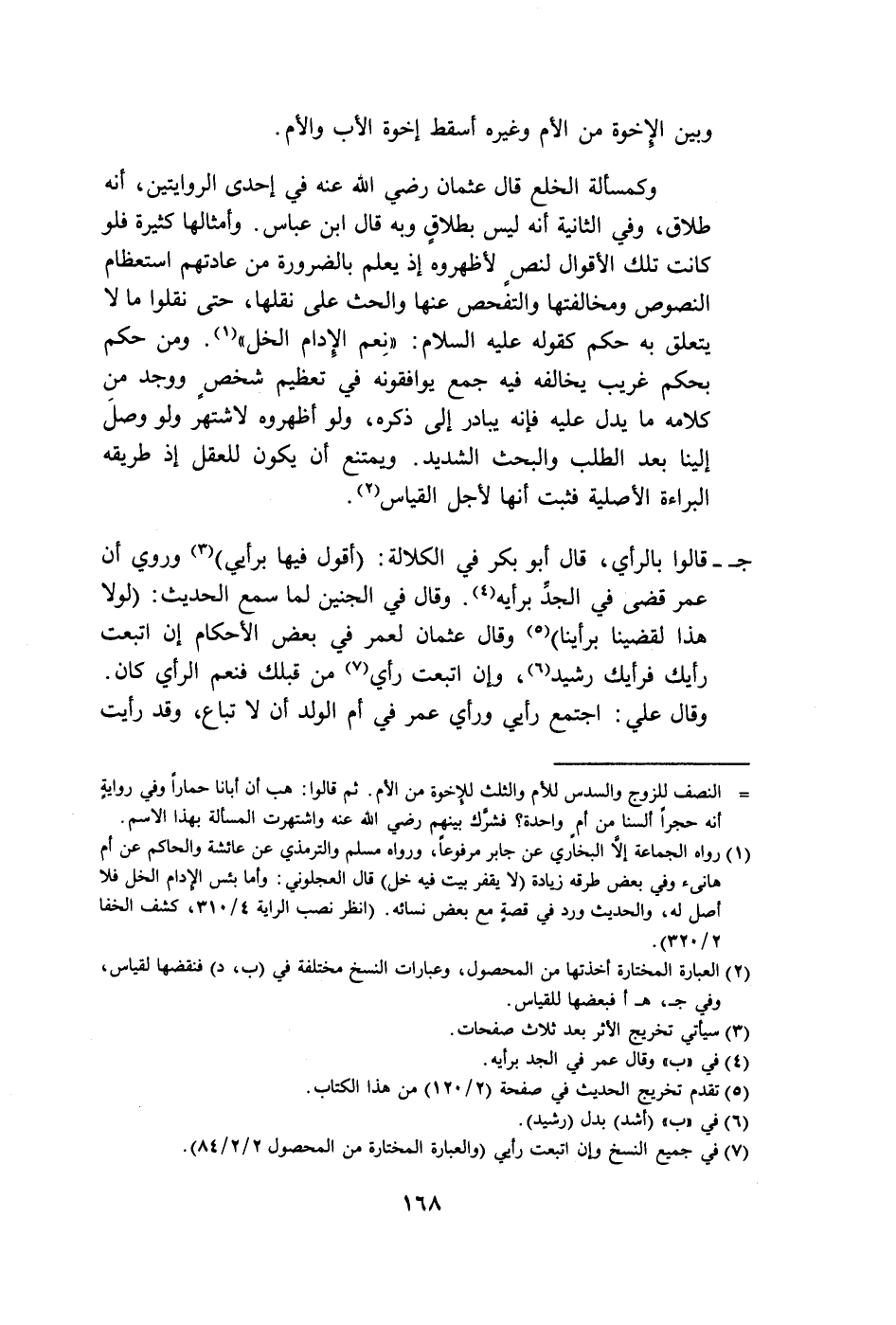 وكمسألة الخلع قال عثمان رضي الله عنه في إحدى الروايتين، أنَّه طلاق، وفي الثَّانية أنَّه ليس بطلاقٍ وبه قال ابن عباس. وأمثالها كثيرة فلو كانت تلك الأقوال لنصٍ لأظهروه إذ يعلم بالضرورة من عادتهم استعظام النصوص ومخالفتها والتفحص عنها والحث على نقلها، حتَّى نقلوا ما لا يتعلق به حكم كقوله عليه السلام: "نِعم الِإدام النحل" (١). ومن حكم بحكم غريب يخالفه فيه جمع يوافقونه في تعظيم شخصٍ ووجد من كلامه ما يدل عليه فإنَّه يبادر إلى ذكره، ولو أظهروه لاشتهر ولو وصلَ إلينا بعد الطلب والبحث الشديد. ويمتنع أن يكون للعقل إذ طريقه البراءة الأصلية فثبت أنها لأجل القياس (٢).