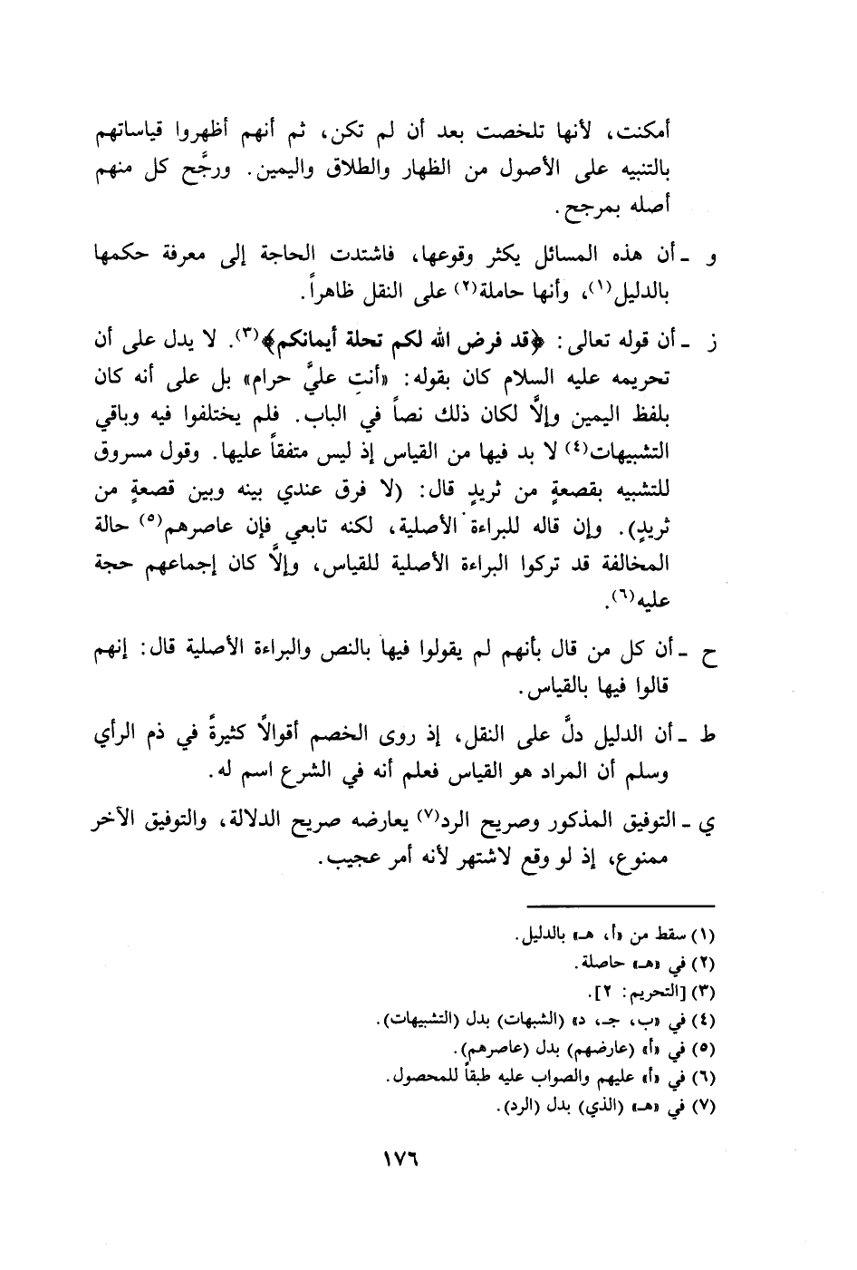 ز- أن قوله تعالى: {قَدْ فَرَضَ اللَّهُ لَكُمْ تَحِلَّةَ أَيْمَانِكُمْ} (٣). لا يدل على أن تحريمه عليه السلام كان بقوله: "أنتِ عليَّ حرام" بل على أنَّه كان بلفظ اليمين وإلَّا لكان ذلك نصًا في الباب. فلم يختلفوا فيه وباقي التشبيهات (٤) لابد فيها من القياس إذ ليس متفقًا عليها. وقول مسروق للتشبيه بقصعةٍ من ثريدٍ قال: إلَّا فرق عندي بينه وبين قصعةٍ من ثريدٍ). وإن قاله للبراءة الأصلية، لكنه تابعي فإن عاصرهم (٥) حالة المخالفة قد تركوا البراءة الأصلية للقياس، وإلاَّ كان إجماعهم حجة عليه (٦).