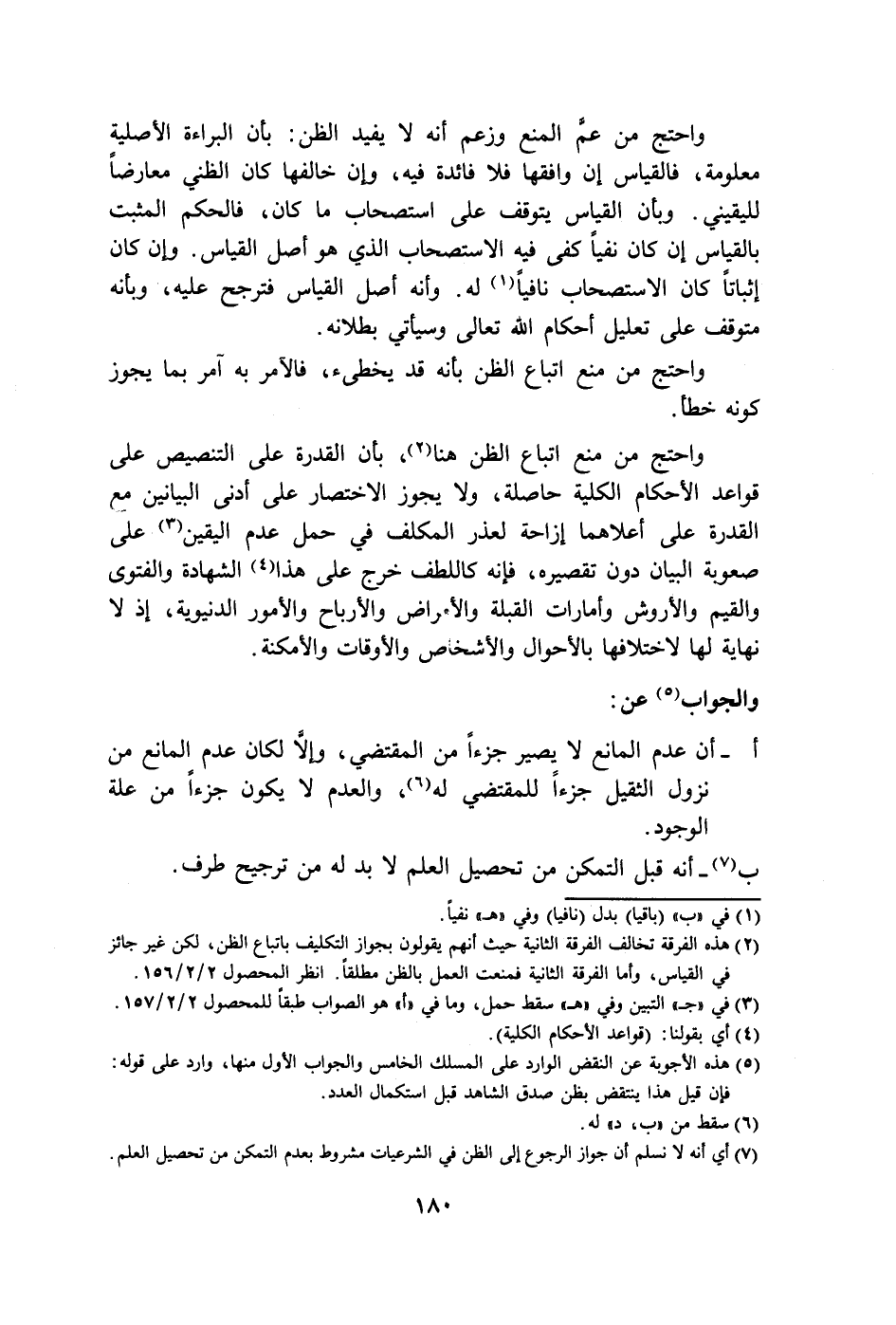 (٧) أي أنَّه لا نسلم أن جواز الرجوع إلى الظن في الشرعيات مشروط بعدم التمكن من تحصيل العلم.