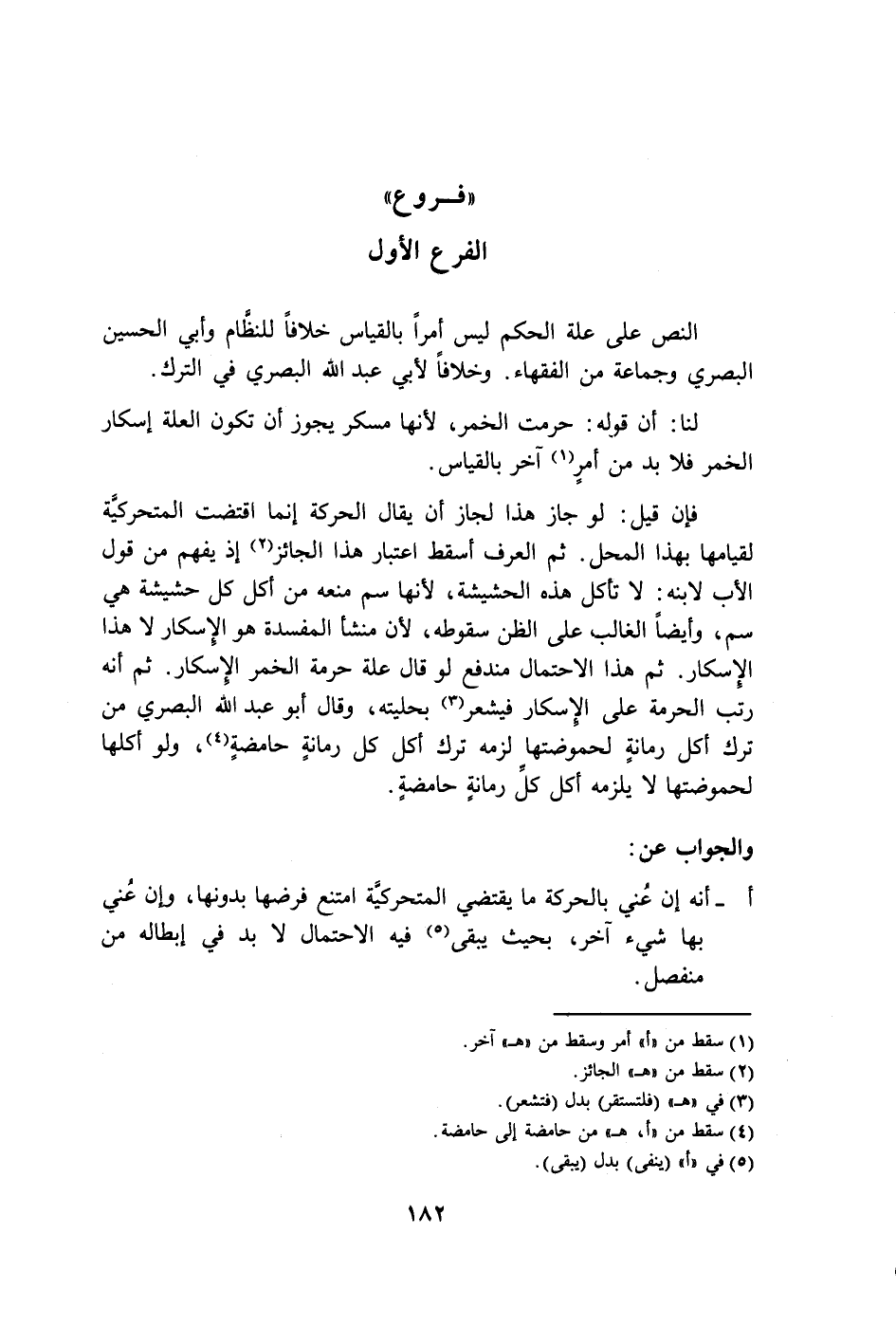 فإن قيل: لو جاز هذا لجاز أن يقال الحركة إنما اقتضت المتحركيَّة لقيامها بهذا المحل. ثم العرف أسقط اعتبار هذا الجائز (٢) إذ يفهم من قول الأب لابنه: لا تأكل هذه الحشيشة, لأنها سم منعه من أكل كل حشيشة هي سم، وأيضًا الغالب على الظن سقوطه, لأن منشأ المفسدة هو الإسكار لا هذا الإسكار. ثم هذا الاحتمال مندفع لو قال علة حرمة الخمر الإسكار. ثم أنَّه