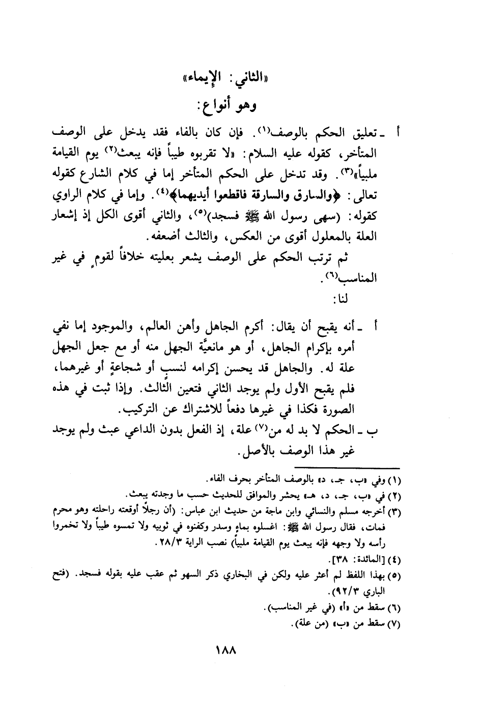 أ- تعليق الحكم بالوصف (١). فإن كان بالفاء فقد يدخل على الوصف المتأخر، كقوله عليه السلام: "لا تقربوه طيبًا فإنَّه يبعث (٢) يوم القيامة ملبيًا" (٣). وقد تدخل على الحكم المتأخر إما في كلام الشارع كقوله تعالى: {وَالسَّارِقُ وَالسَّارِقَةُ فَاقْطَعُوا أَيْدِيَهُمَا} (٤). وإما في كلام الراوي كقوله: (سهى رسول الله-صَلَّى اللهُ عَلَيْهِ وَسَلَّمَ- فسجد) (٥)، والثاني أقوى الكل إذ إشعار