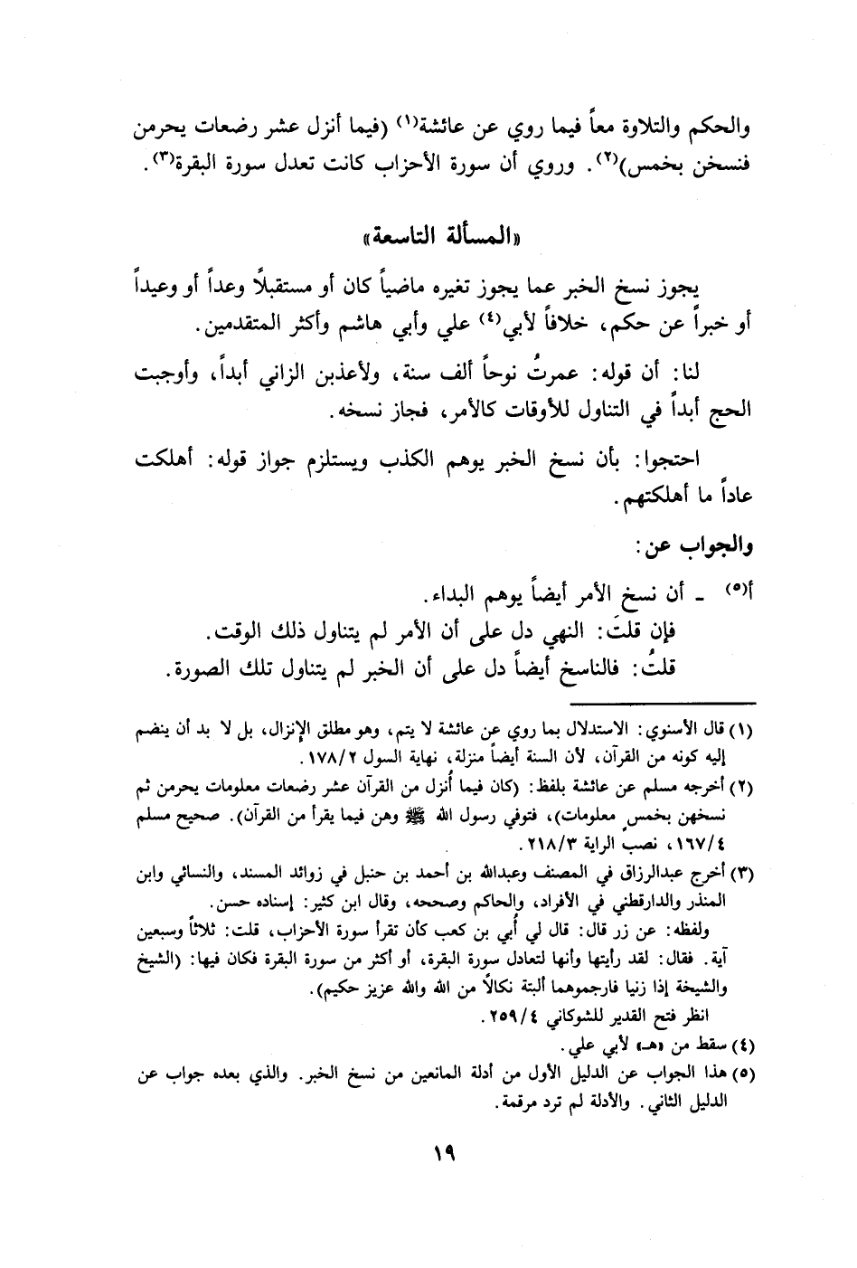 (٥) هذا الجواب عن الدليل الأول من أدلة المانعين من نسخ الخبر. والذي بعده جواب عن الدليل الثاني. والأدلة لم ترد مرقمة.