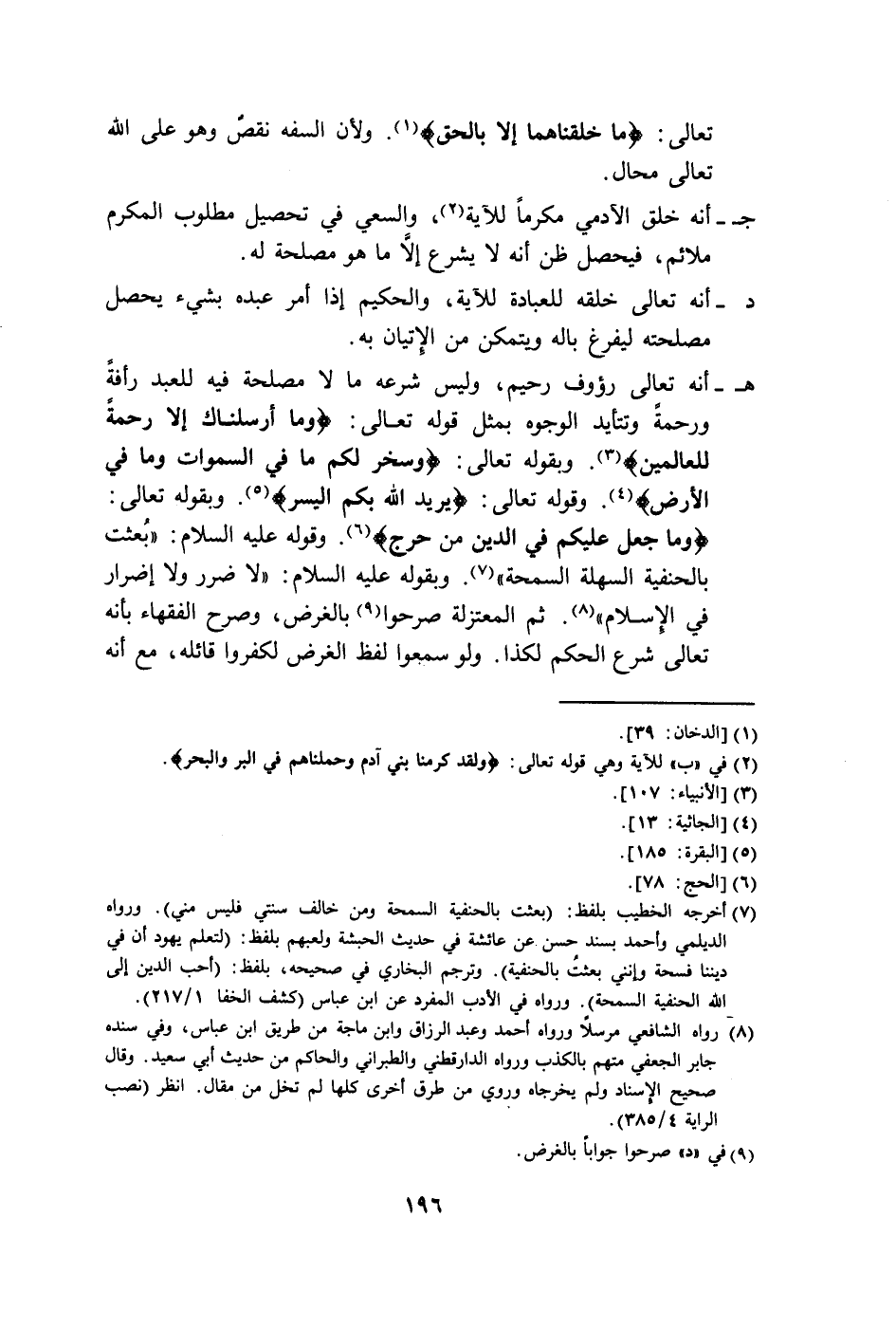 هـ- أنَّه تعالى رؤوف رحيم، وليس شرعه ما لا مصلحة فيه للعبد رأفةً ورحمةً وتتأيد الوجوه بمثل قوله تعالى: {وَمَا أَرْسَلْنَاكَ إِلَّا رَحْمَةً لِلْعَالَمِينَ} (٣). وبقوله تعالى: {وَسَخَّرَ لَكُمْ مَا فِي السَّمَاوَاتِ وَمَا فِي الْأَرْضِ} (٤). وقوله تعالى: {يُرِيدُ اللَّهُ بِكُمُ الْيُسْرَ} (٥). وبقوله تعالى: {وَمَا جَعَلَ عَلَيْكُمْ فِي الدِّينِ مِنْ حَرَجٍ} (٦). وقوله عليه السلام: "بُعثت بالحنفية السهلة السمحة" (٧). وبقوله عليه السلام: "لا ضرر ولا إضرار في الإِسلام" (٨). ثم المعتزلة صرحوا (٩) بالغرض، وصرح الفقهاء بأنه تعالى شرع الحكم لكذا. ولو سمعوا لفظ الغرض لكفروا قائله، مع أنَّه