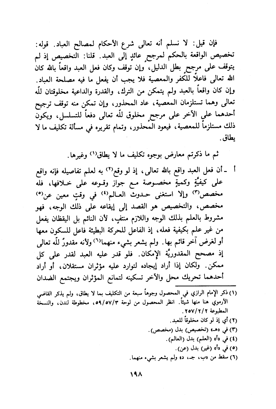 (١) ذكر الإِمام الرَّازيّ في المحصول وجوهًا سبعة من التكليف بما لا يطاق، ولم يذكر القاضي الأرموي هنا منها شيئًا. انظر المحصول من لوحة ٣/ ٥٧/ ٥٩، مخطوطة لندن، والنسخة المطبوعة ٢/ ٢/ ٢٥٧.