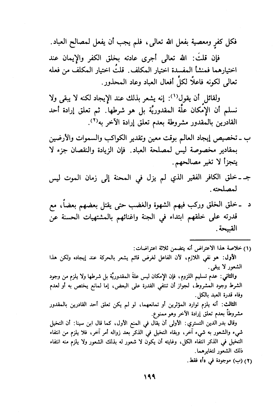 فإن قلتَ: الله تعالى أجرى عادته بخلق الكفر والإيمان عند اختيارهما فمنشأ المفسدة اختيار المكلف. قلت اختيار المكلف من فعله تعالى لكونه فاعلًا لكل أفعال العباد وعاد المحذور.