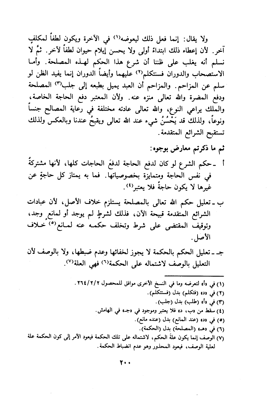 ولا يقال: إنما فعل ذلك ليعوضه (١) في الآخرة ويكون لطفًا لمكلفٍ آخر. لأن إعطاء ذلك ابتداءً أولى ولا يحسن إيلام حيوان لطفًا لآخر. ثم لا نسلم أنَّه يغلب على ظننا أن شرع هذا الحكم لهذه المصلحة. وأما الاستصحاب والدوران فسنتكلم (٢) عليهما وأيضًا الدوران إنما يفيد الظن لو سلم عن المزاحم. والمزاحم أن العبد يميل بطبعه إلى جلب (٣) المصلحة ودفع المضرة والله تعالى منزه عنه. ولأن المعتبر دفع الحاجة الخاصة، والملك يراعي النوع، والله تعالى عادته مختلفة في رعاية المصالح جنسًا ونوعًا، ولذلك قد يَحْسُنُ شيء عند الله تعالى ويقبحُ عندنا وبالعكس ولذلك تستقبح الشرائع المتقدمة.