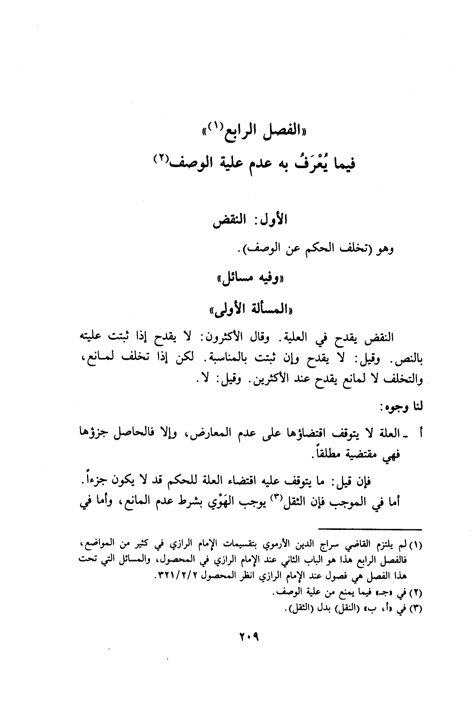 (١) لم يلتزم القاضي سراج الدين الأرموي بتقسيمات الإمام الرازي في كثير من المواضع، فالفصل الرابع هذا هو الباب الثاني عند الإمام الرازي في المحصول، والمسائل التي تحت هذا الفصل هي فصول عند الإمام الرازي انظر المحصول ٢/ ٢/ ٣٢١.