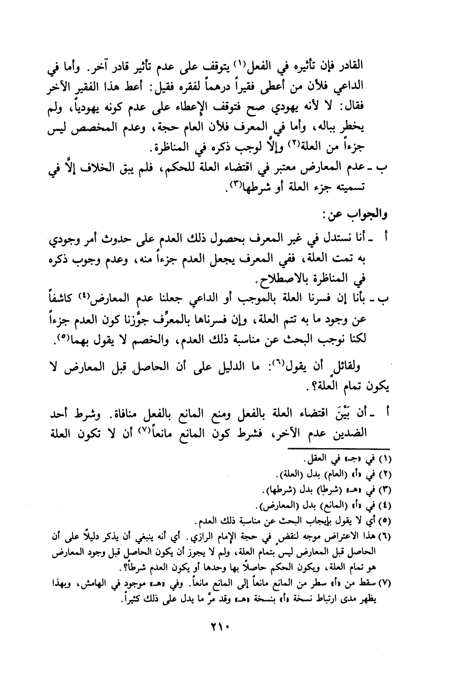 (٦) هذا الاعتراض موجه لنقض في حجة الإمام الرازي. أي أنه ينبغي أن يذكر دليلاً على أن الحاصل قبل المعارض ليس بتمام العلة، ولم لا يجوز أن يكون الحاصل قبل وجود المعارض هو تمام العلة، ويكون الحكم حاصلاً بها وحدها أو يكون العدم شرطاً؟.