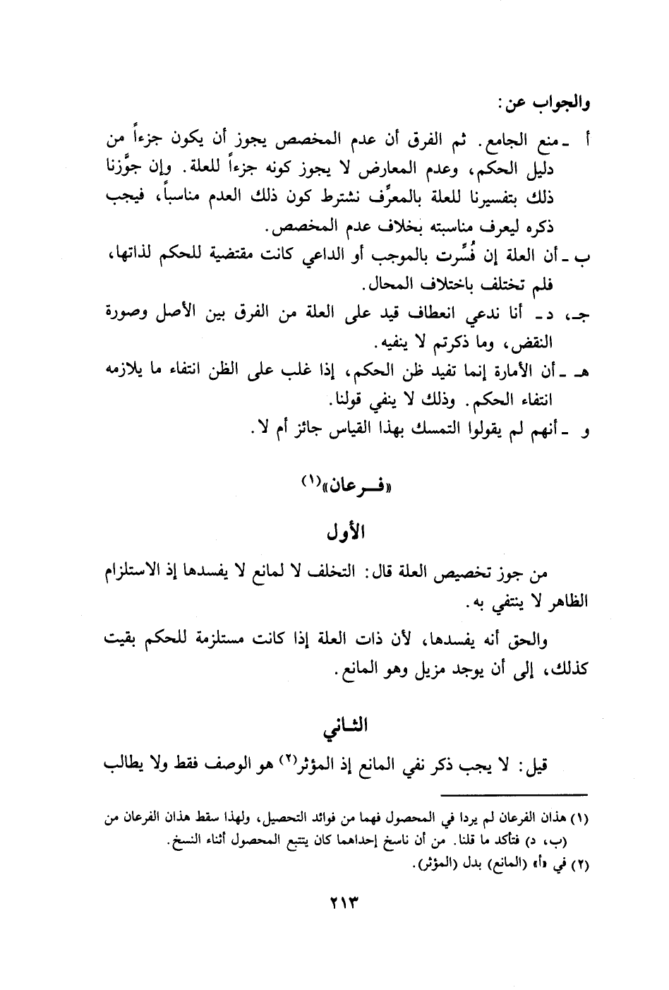 أ - منع الجامع. ثم الفرق أن عدم المخصص يجوز أن يكون جزءاً من دليل الحكم، وعدم المعارض لا يجوز كونه جزءاً للعلة. وإن جوَّزنا ذلك بتفسيرنا للعلة بالمعرَّف نشترط كون ذلك العدم مناسباً، فيجب ذكره ليعرف مناسبته بخلاف عدم المخصص.