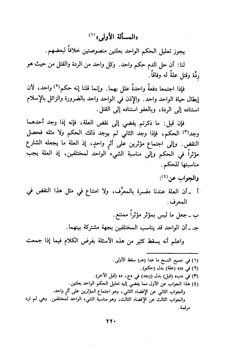 (٤) هذا الجواب عن الأول مما يفضي إليه تعليل الحكم الواحد بعلتين.