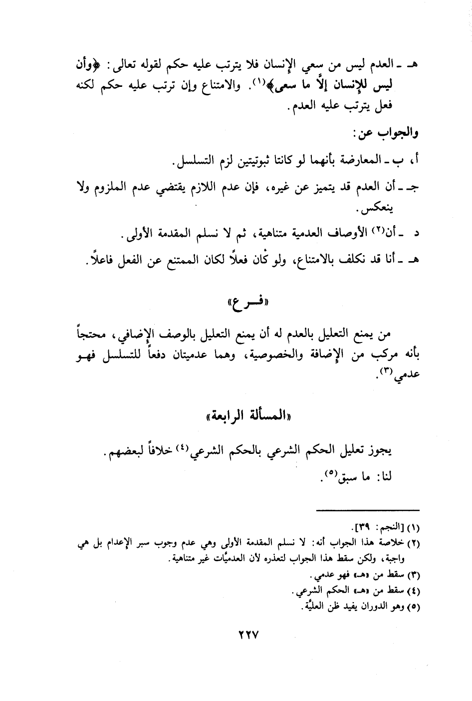 هـ - العدم ليس من سعي الِإنسان فلا يترتب عليه حكم لقوله تعالى: {وَأَنْ لَيْسَ لِلْإِنْسَانِ إِلَّا مَا سَعَى} (١). والامتناع وإن ترتب عليه حكم لكنه فعل يترتب عليه العدم.