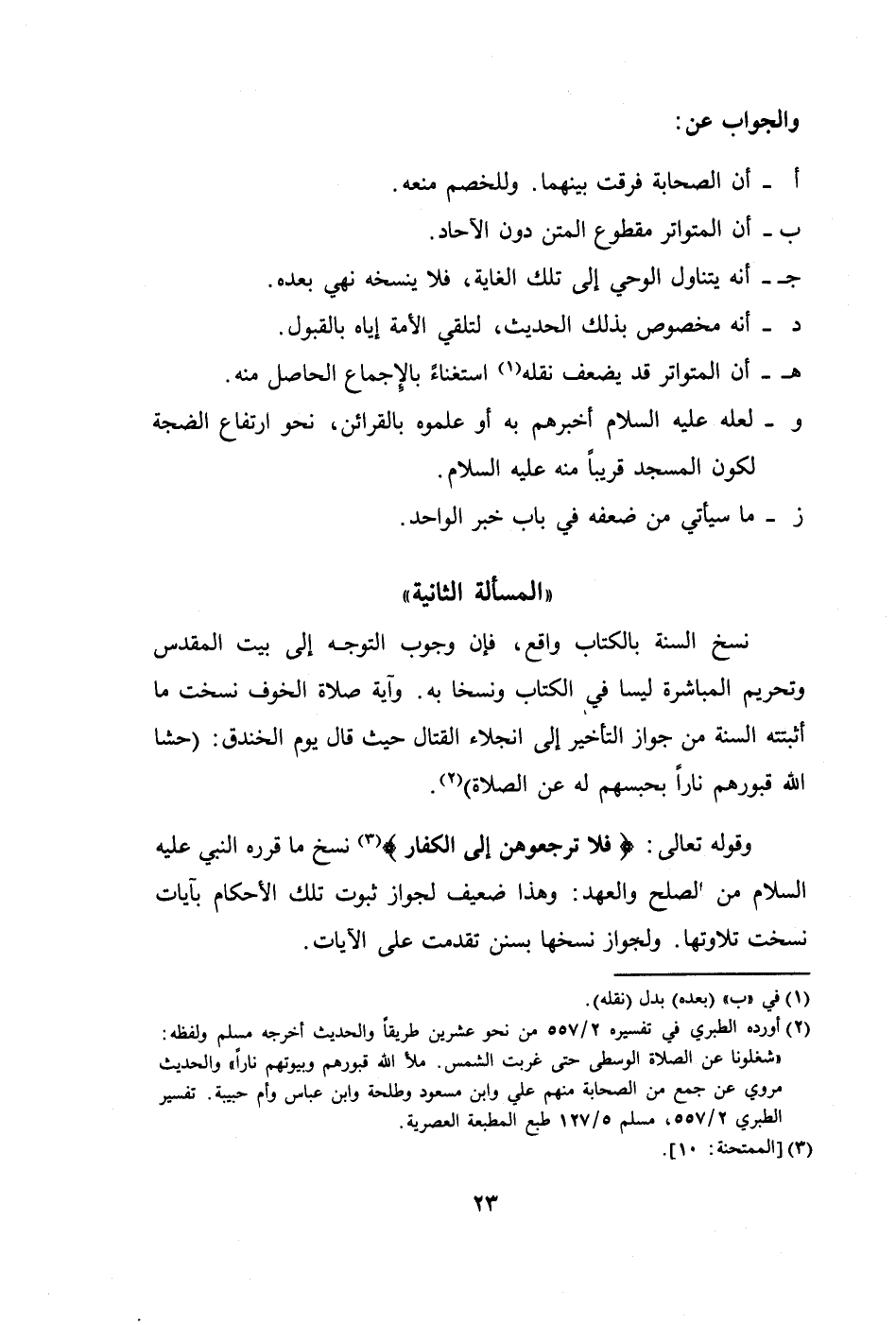 وقوله تعالى: {فَلَا تَرْجِعُوهُنَّ إِلَى الْكُفَّارِ} (٣) نسخ ما قرره النبي عليه السلام من الصلح والعهد: وهذا ضعيف لجواز ثبوت تلك الأحكام بآيات نسخت تلاوتها. ولجواز نسخها بسنن تقدمت على الآيات.