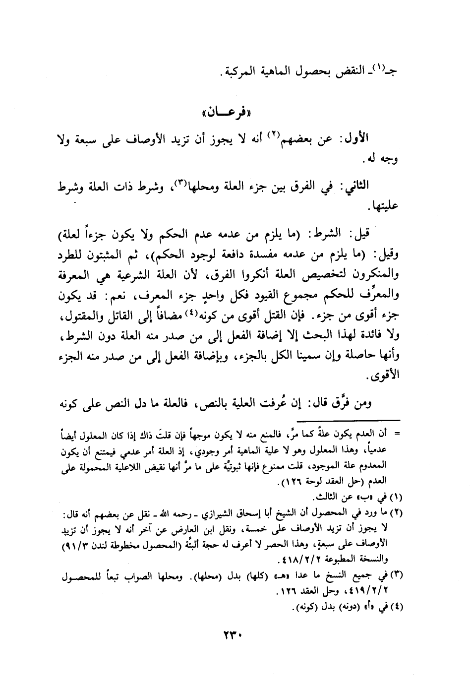 (٢) ما ورد في المحصول أن الشيخ أبا إسحاق الشيرازي - رحمه الله - نقل عن بعضهم أنه قال: لا يجوز أن تزيد الأوصاف على خمسة، ونقل ابن العارض عن آخر أنه لا يجوز أن تزيد الأوصاف على سبعةٍ، وهذا الحصر لا أعرف له حجة ألبتَّة (المحصول مخطوطة لندن ٣/ ٩١) والنسخة المطبوعة ٢/ ٢/ ٤١٨.